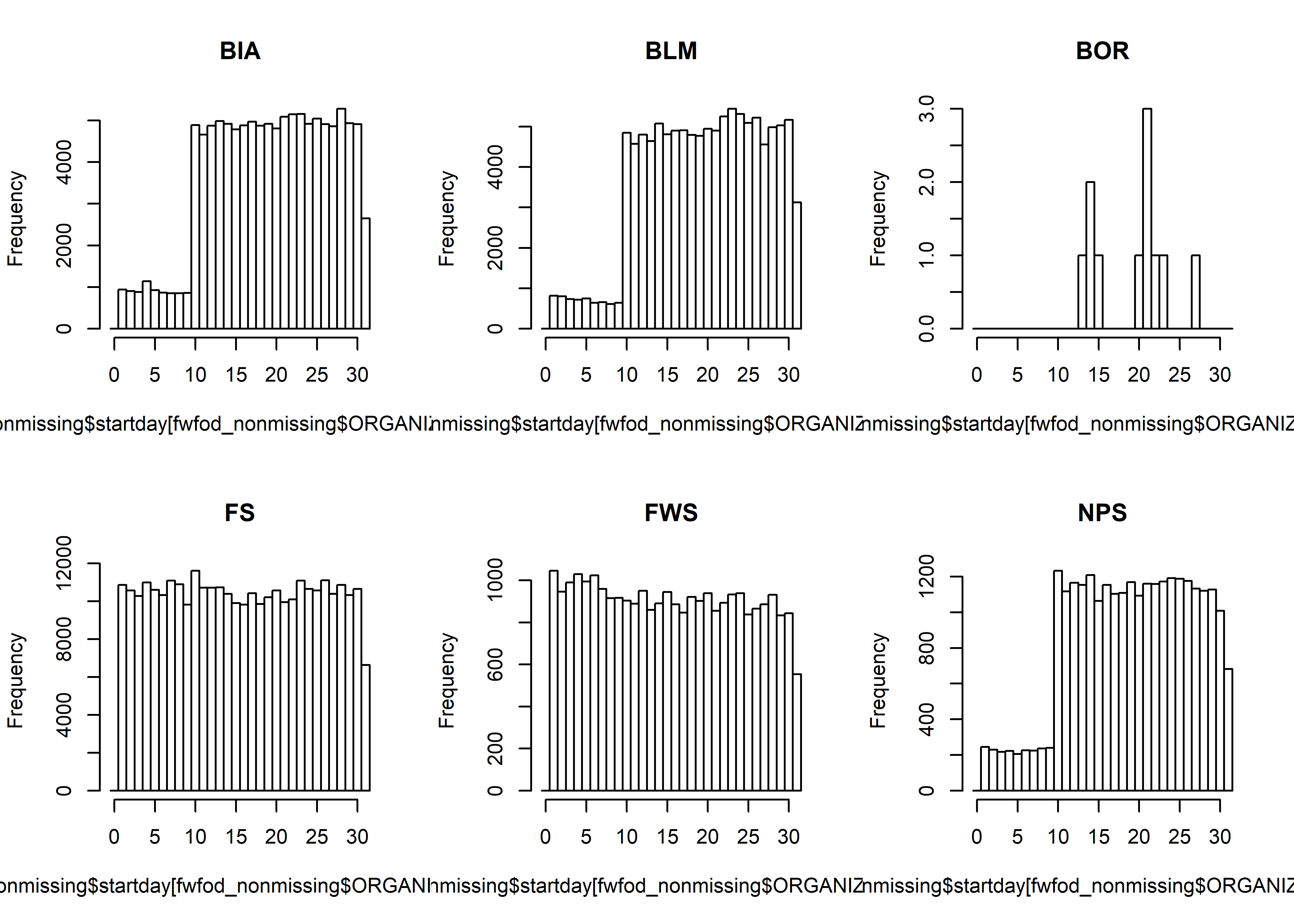 par(oldpar)These plots clearly show that the Forest Service (FS) and Fish and Wildlife Service (FWS) records are complete, and that the missing fires must lie in the BIA, BLM and NPS data sets (and likely also in the BOR data).
