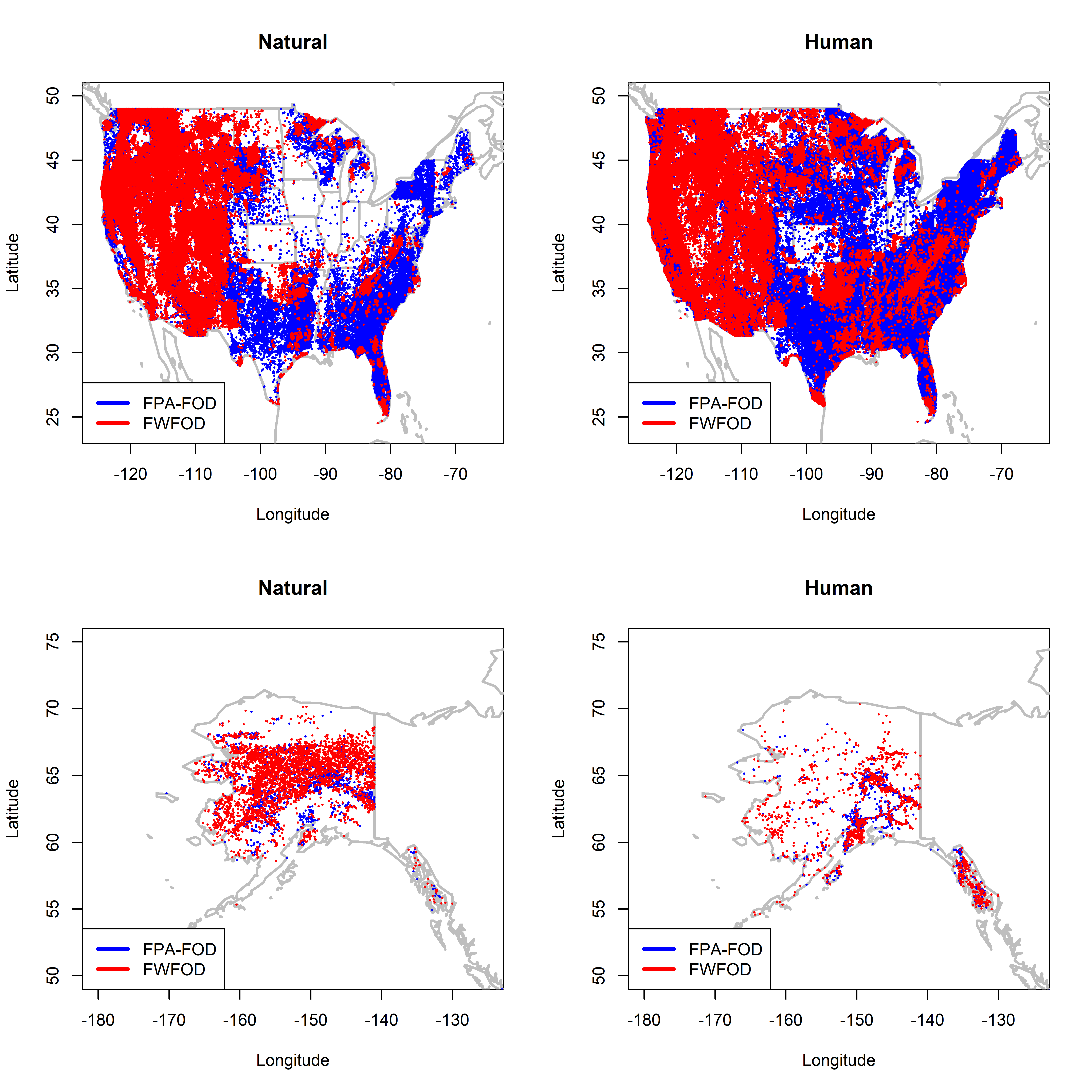 par(oldpar)By plotting the FWFOD data (in blue) over the FPA-FOD data (in red) in the above maps, the location of the additional fires in the FPA-FOD data set becomes apparent. The additional fires in the FPA-FOD data set relative to FWFOD are found mainly in the lower-48 states east of 105 W.