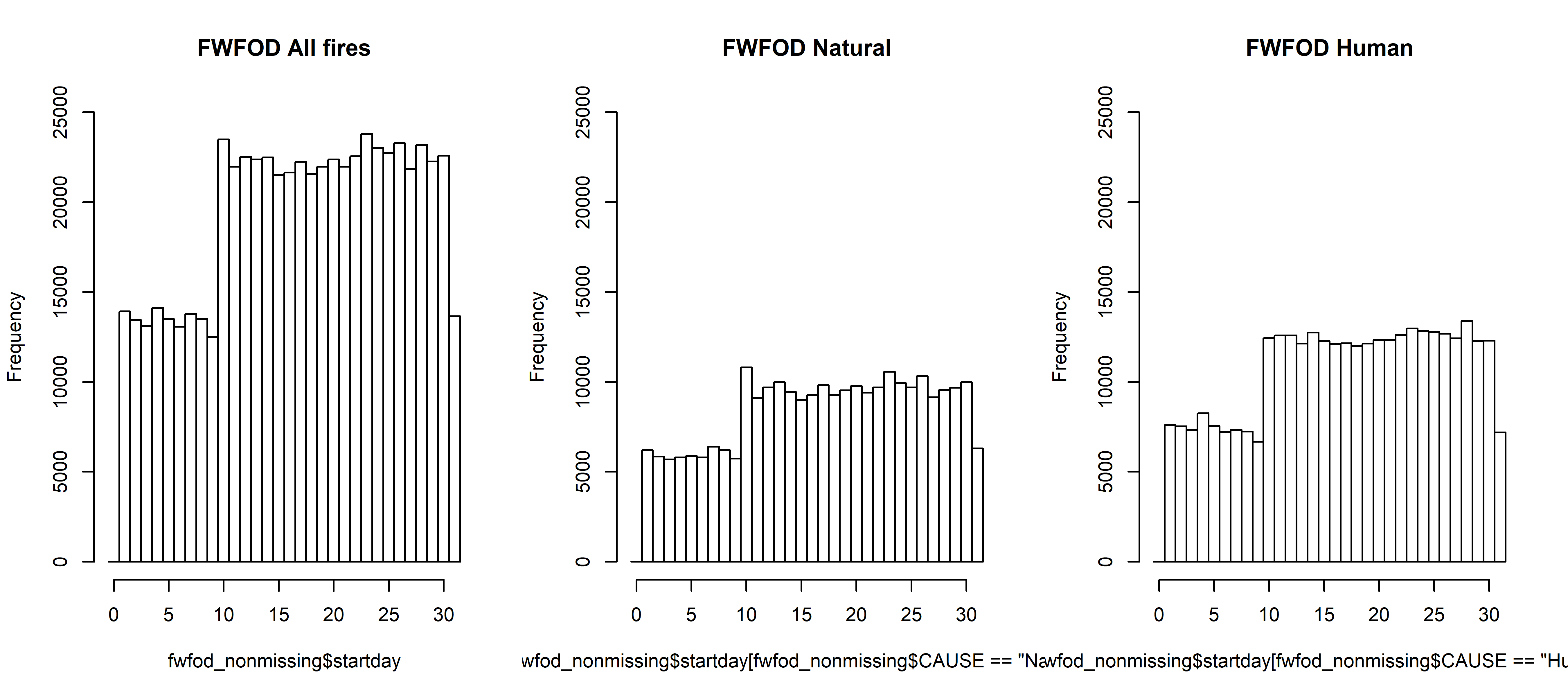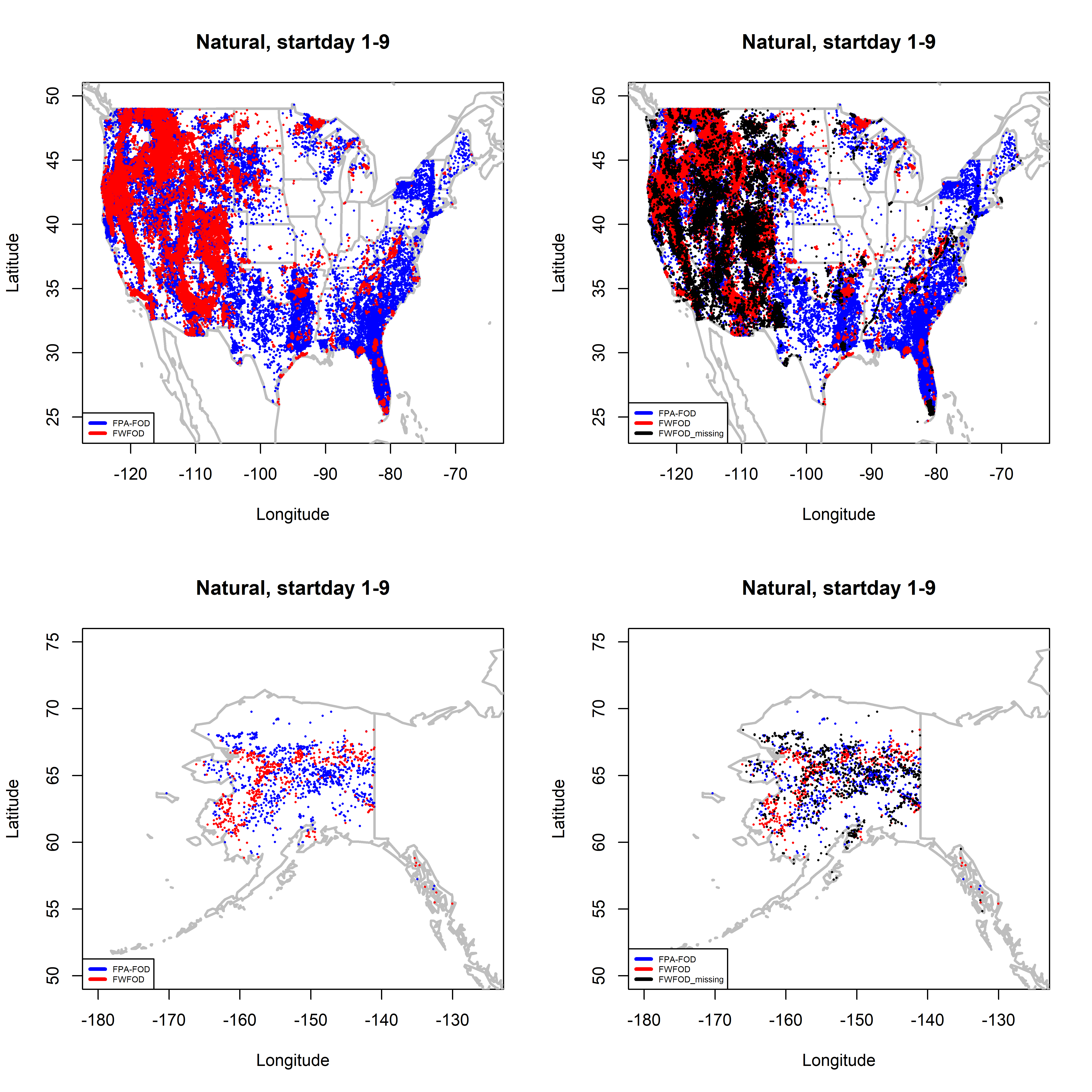par(oldpar)In the above maps, locations were the FPA-FOD data set includes fires with startdays 1-9, but the FWFOD does not, show through in blue in left-hand maps. In the right-haNd maps, particularly for the western U.S., the black missing STARTDATED points fill in many of the areas where the FPA-FOD data show through. This suggests that the “missing” fires on days 1-9 in the FWFOD data may be found among the points with missing STARTDATED values.
