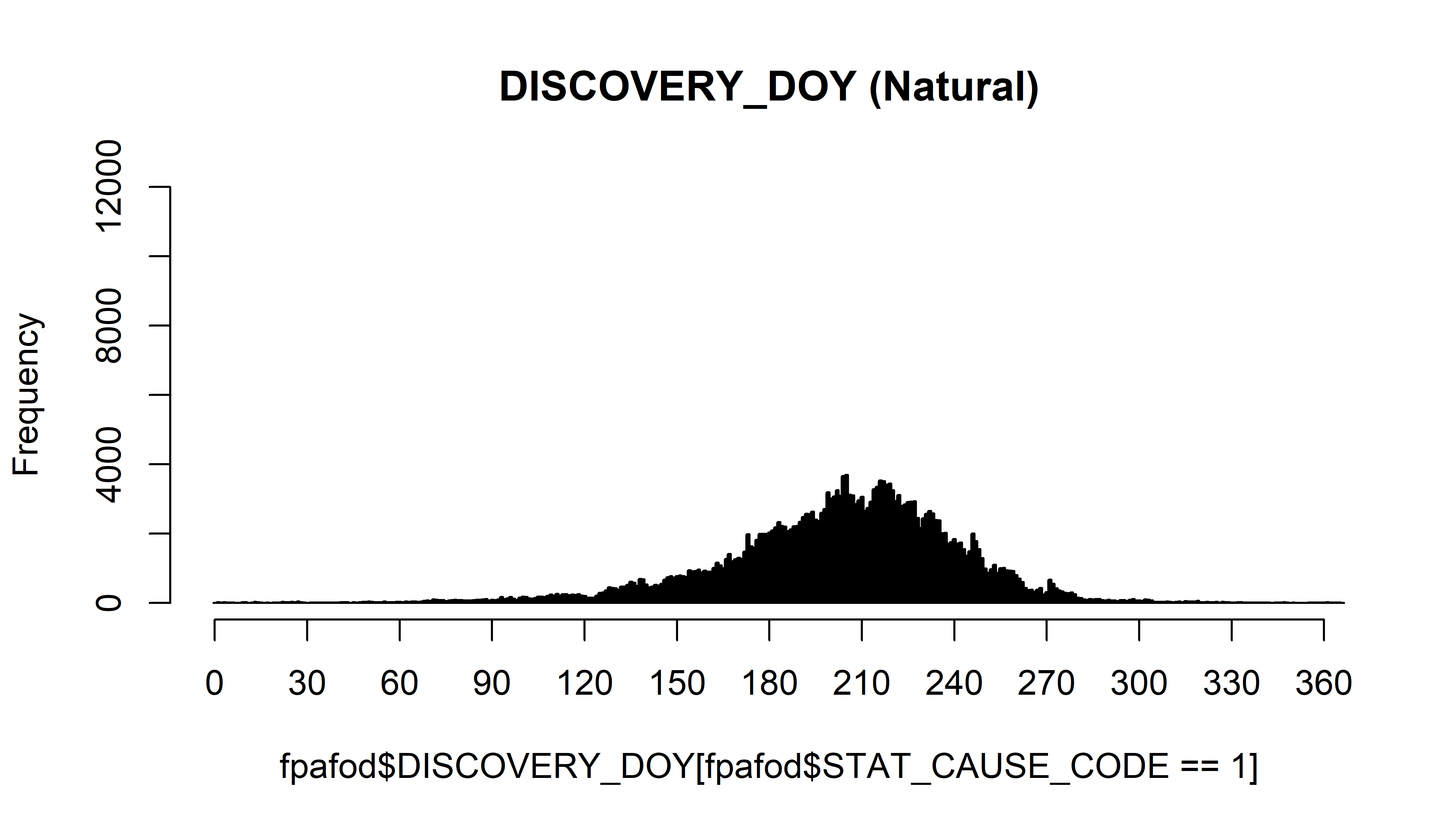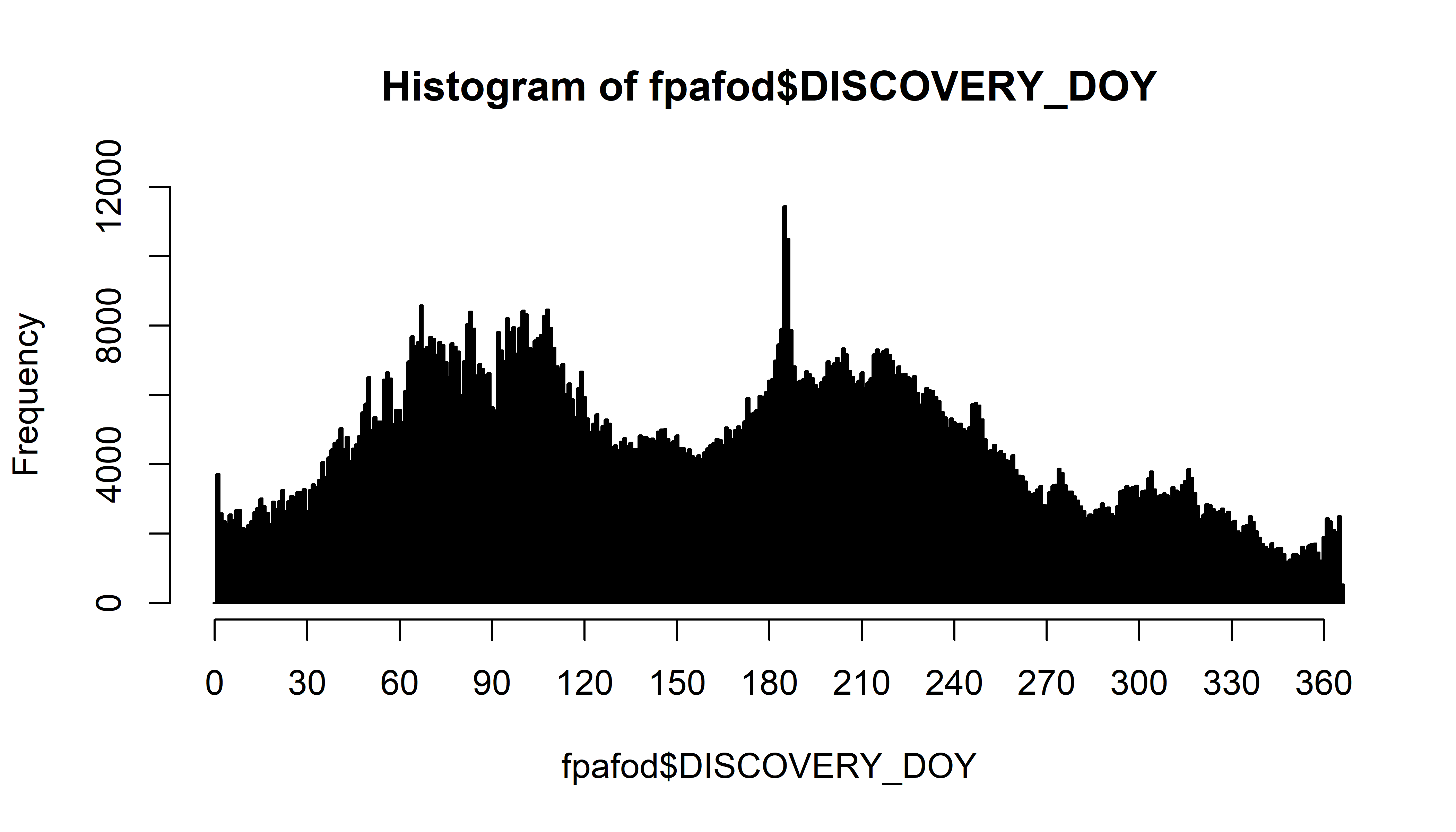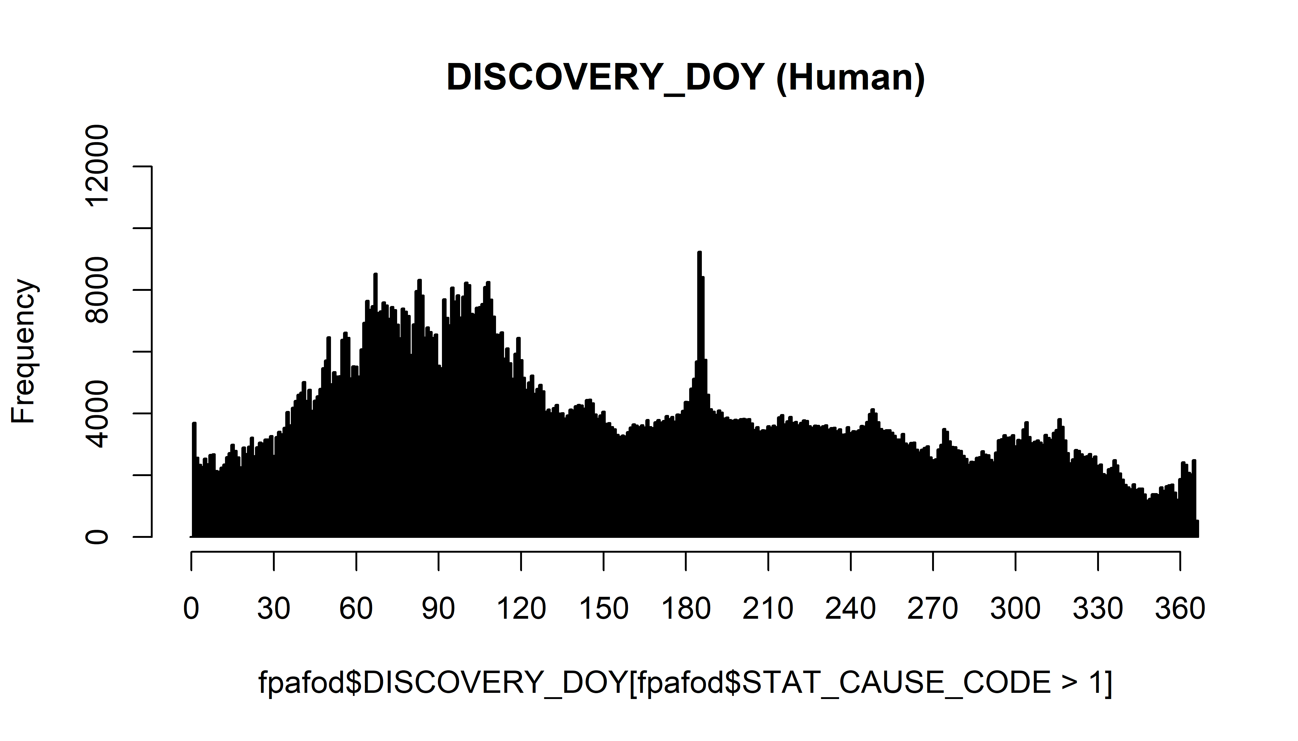 The main unusual feature of this data set is the underrepresentation of fire starts in the first nine days of each month for the first nine months of the year, as will become apparent in this analysis. The data are read here directly from the .dbf file using the read.dbf() function (to minimize the chance that “external” (to R) manipulations of the data might play a role in the unusual features that will emerge from this data set.)