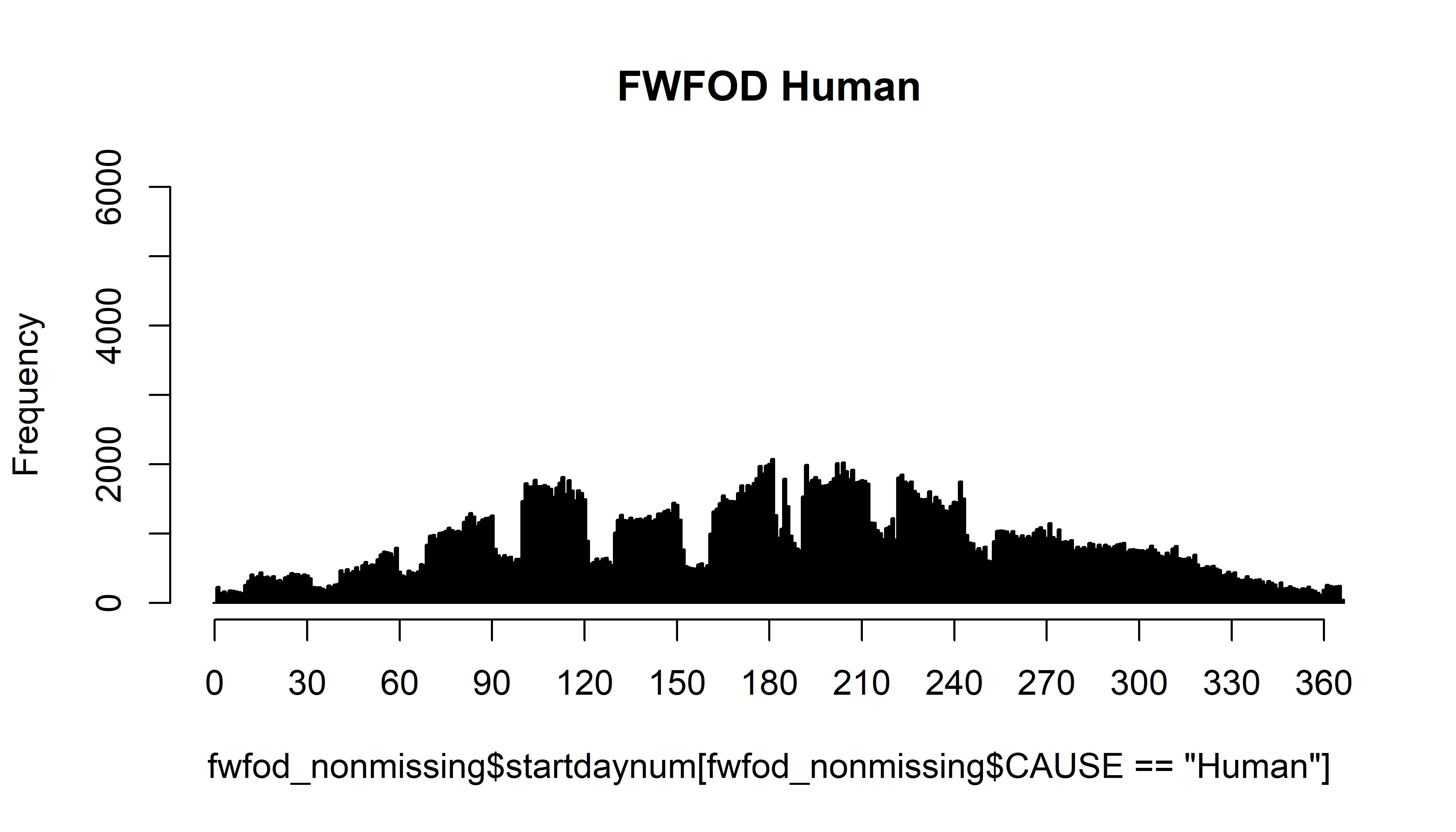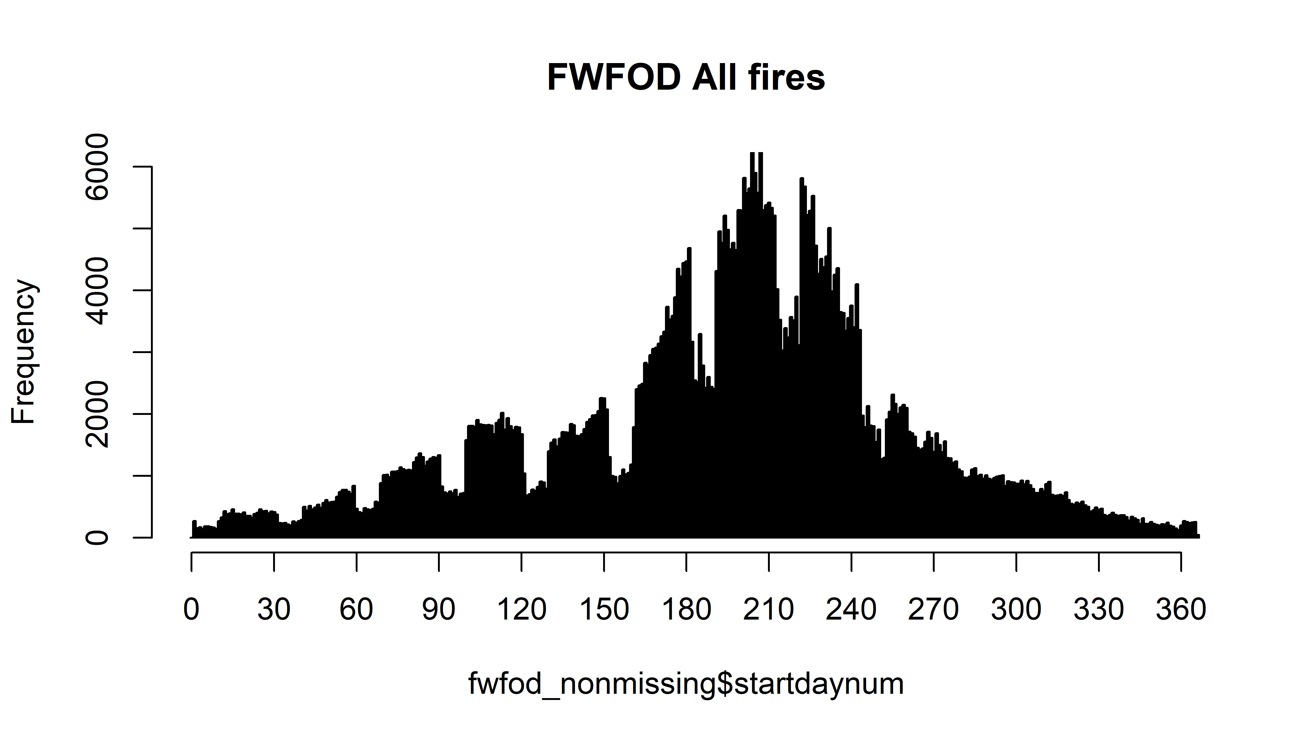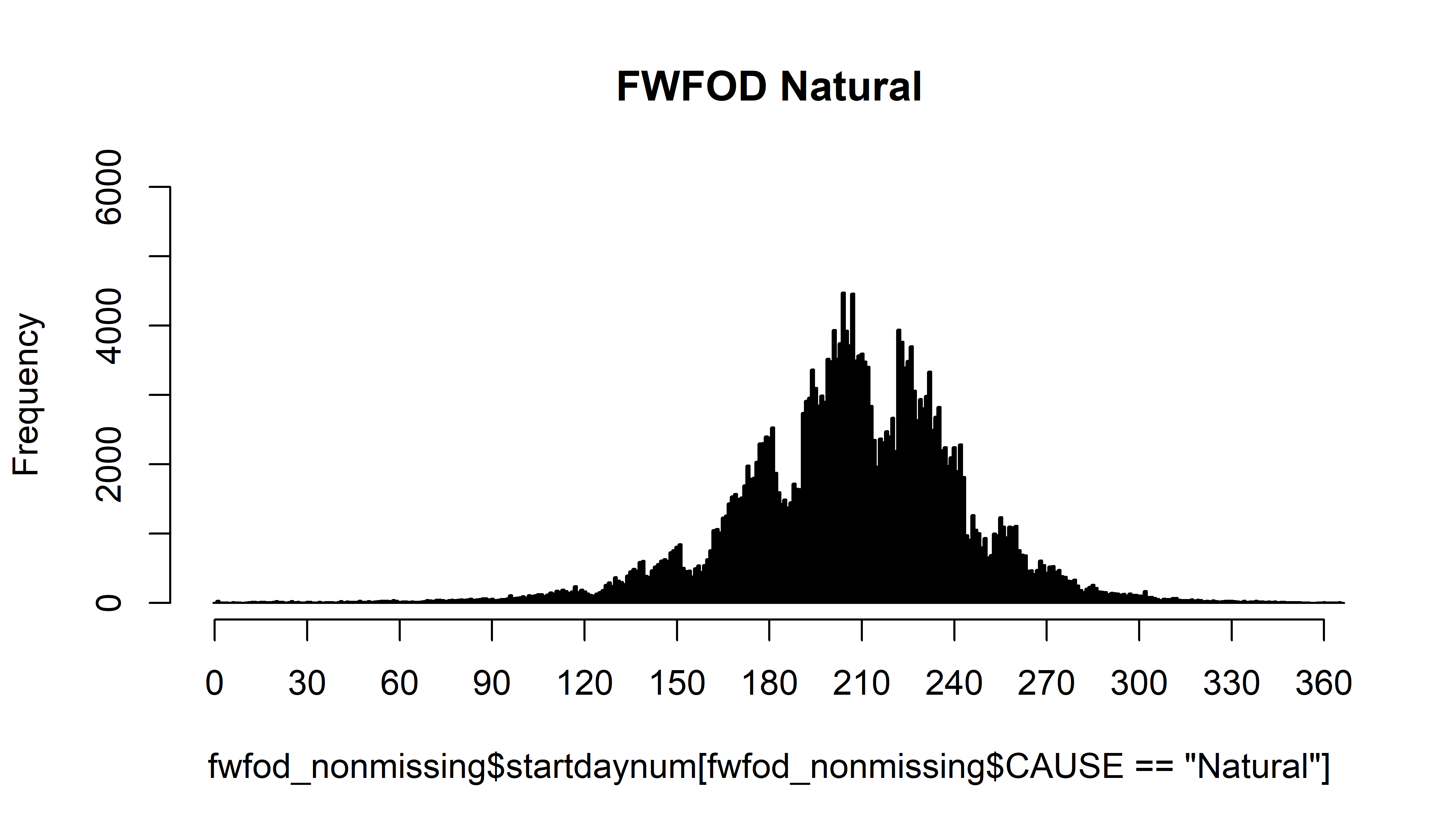 hist(fwfod_nonmissing$startday[fwfod_nonmissing$ORGANIZATI=="FWS"], breaks=seq(-0.5,31.5,by=1), freq=-TRUE, main="FWS")