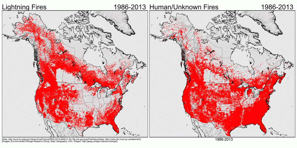 The end product is a merged data set containing the start date, location, ultimate size and cause of 2,089,544 fires, which may be downloaded using the Data link above.