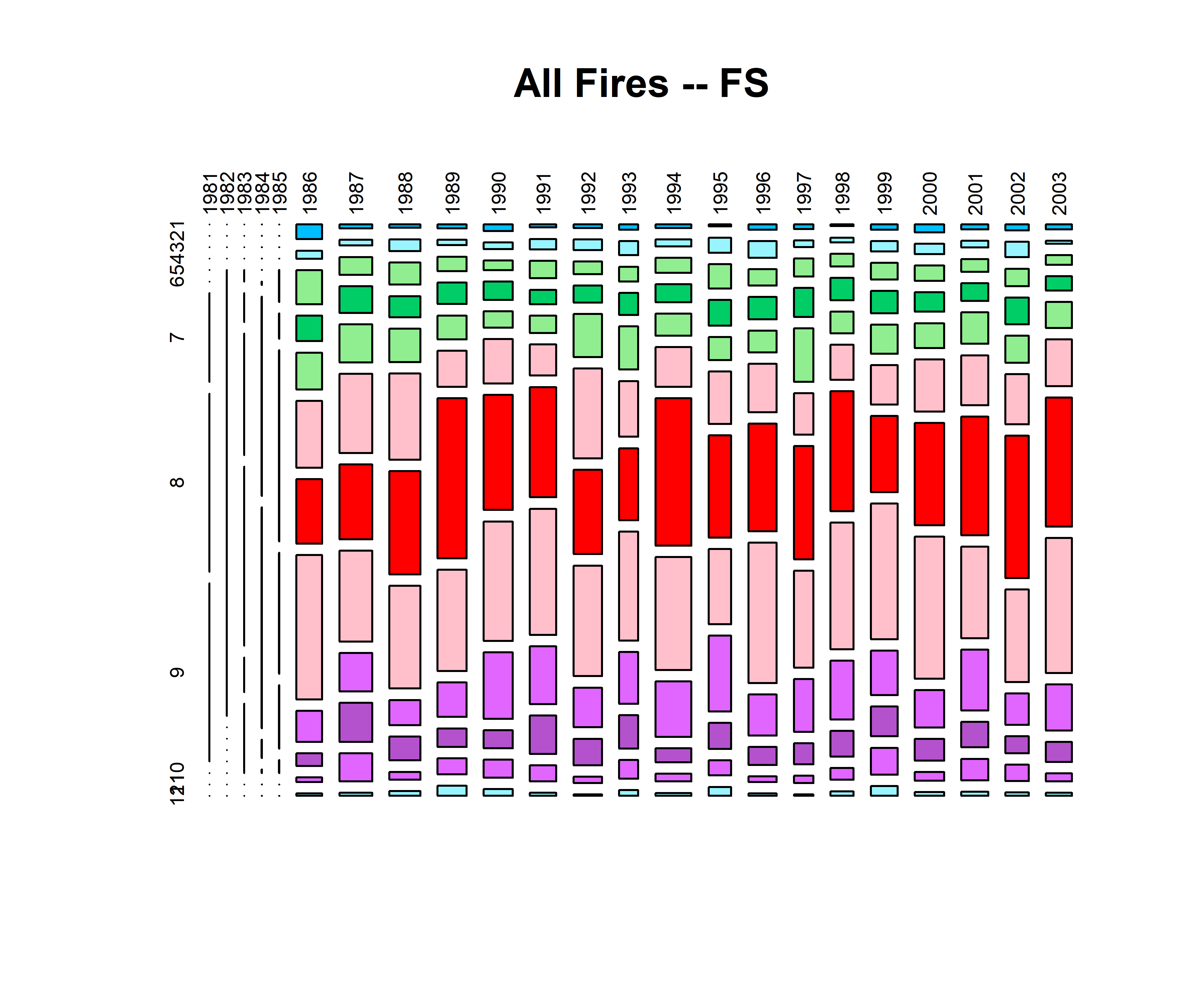mosaicplot(nifc.tablemon, color=monthcolors, cex.axis=0.6, las=3, main="All Fires -- FS")