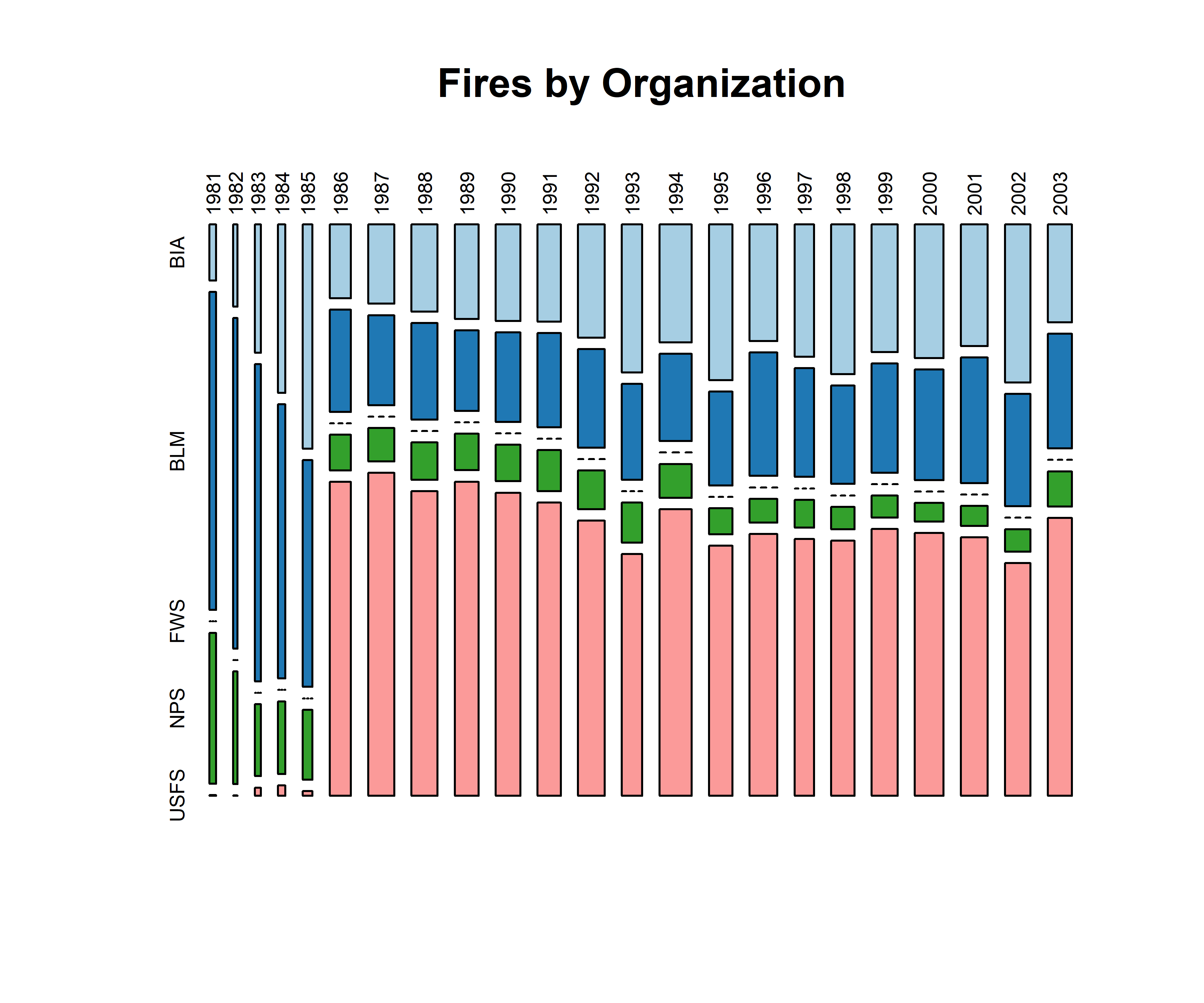 mosaicplot(nifc.tablecause, cex.axis=0.6, las=3, color=mosaiccolor, main="Fires by Organization")