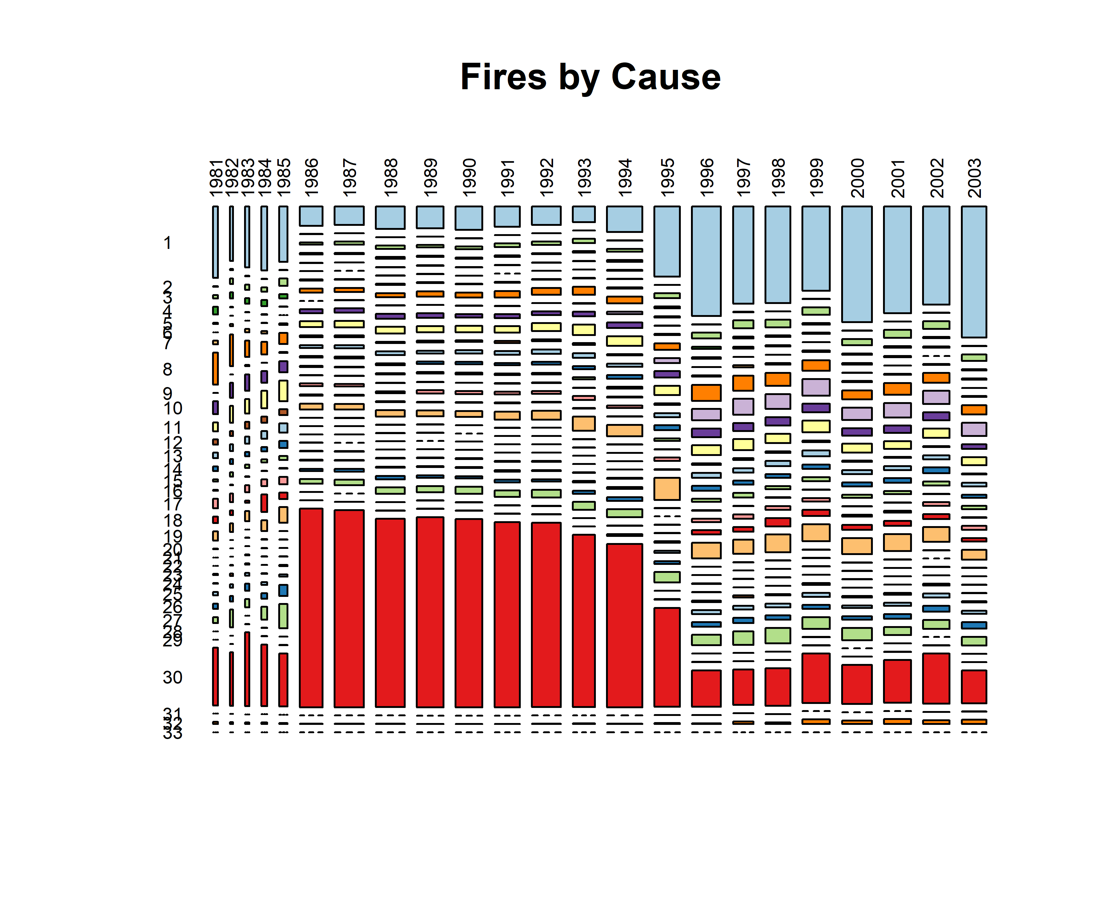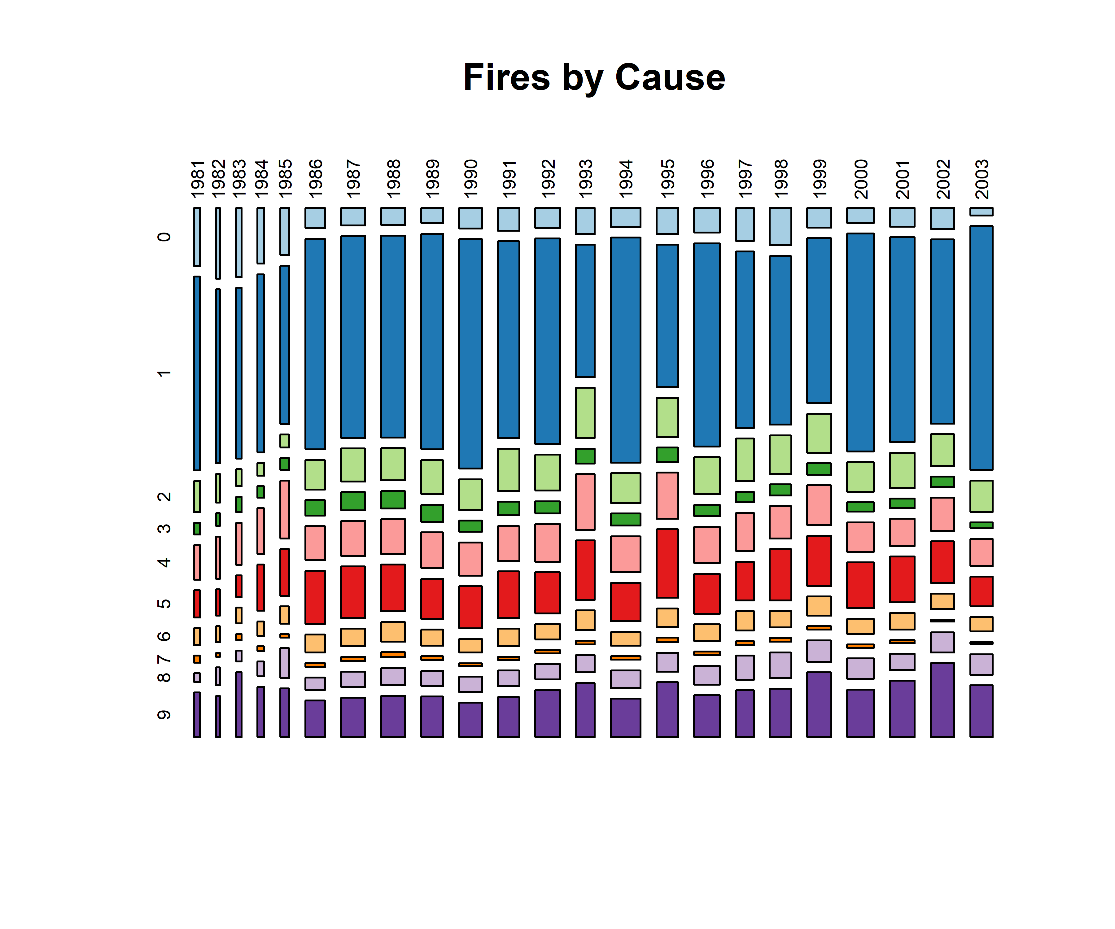 mosaicplot(nifc.tablecause, cex.axis=0.6, las=3, color=mosaiccolor, main="Fires by Cause")