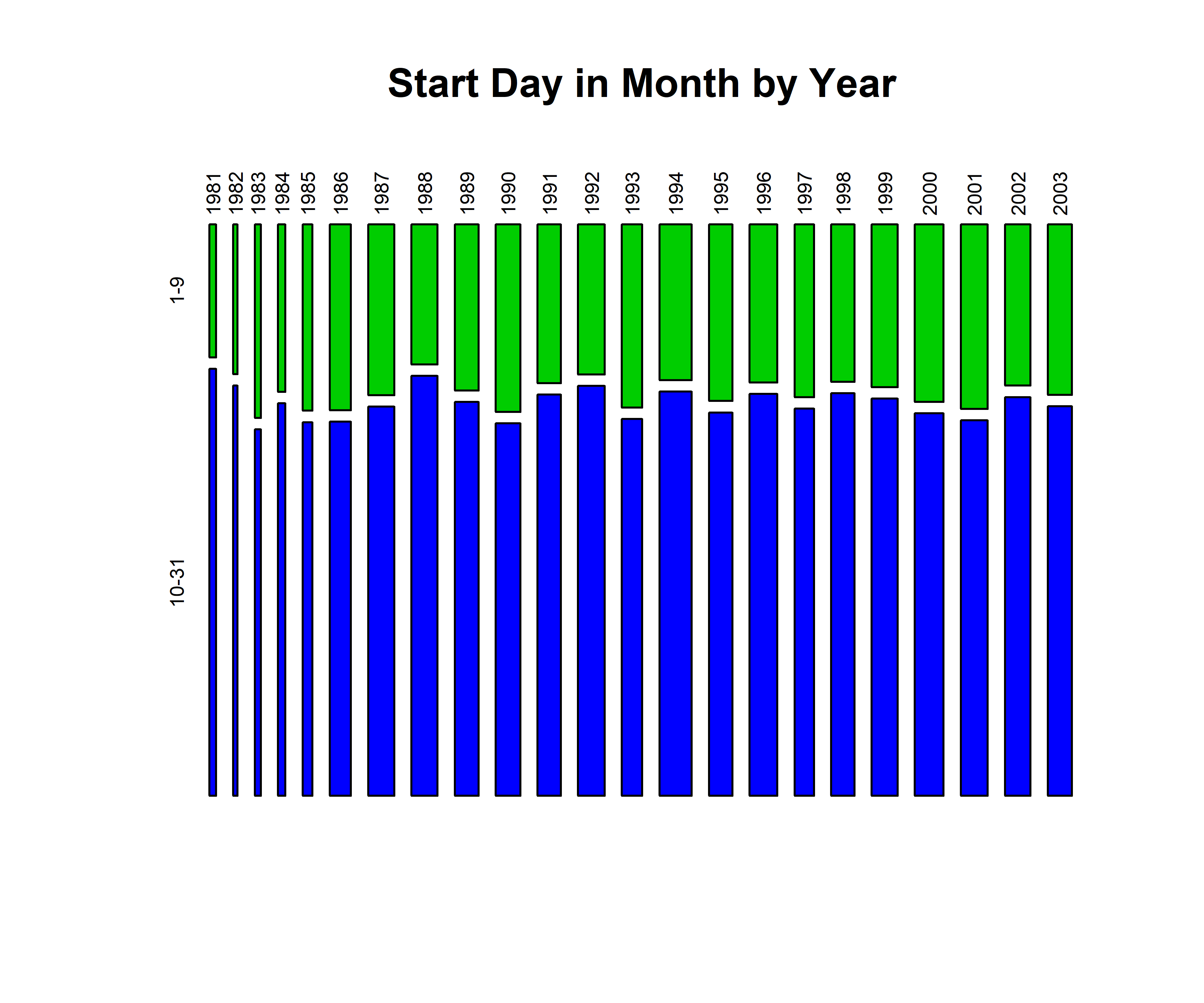 mosaicplot(nifc.table, color=c(3,4), cex.axis=0.6, las=3, main="Start Day in Month by Year")