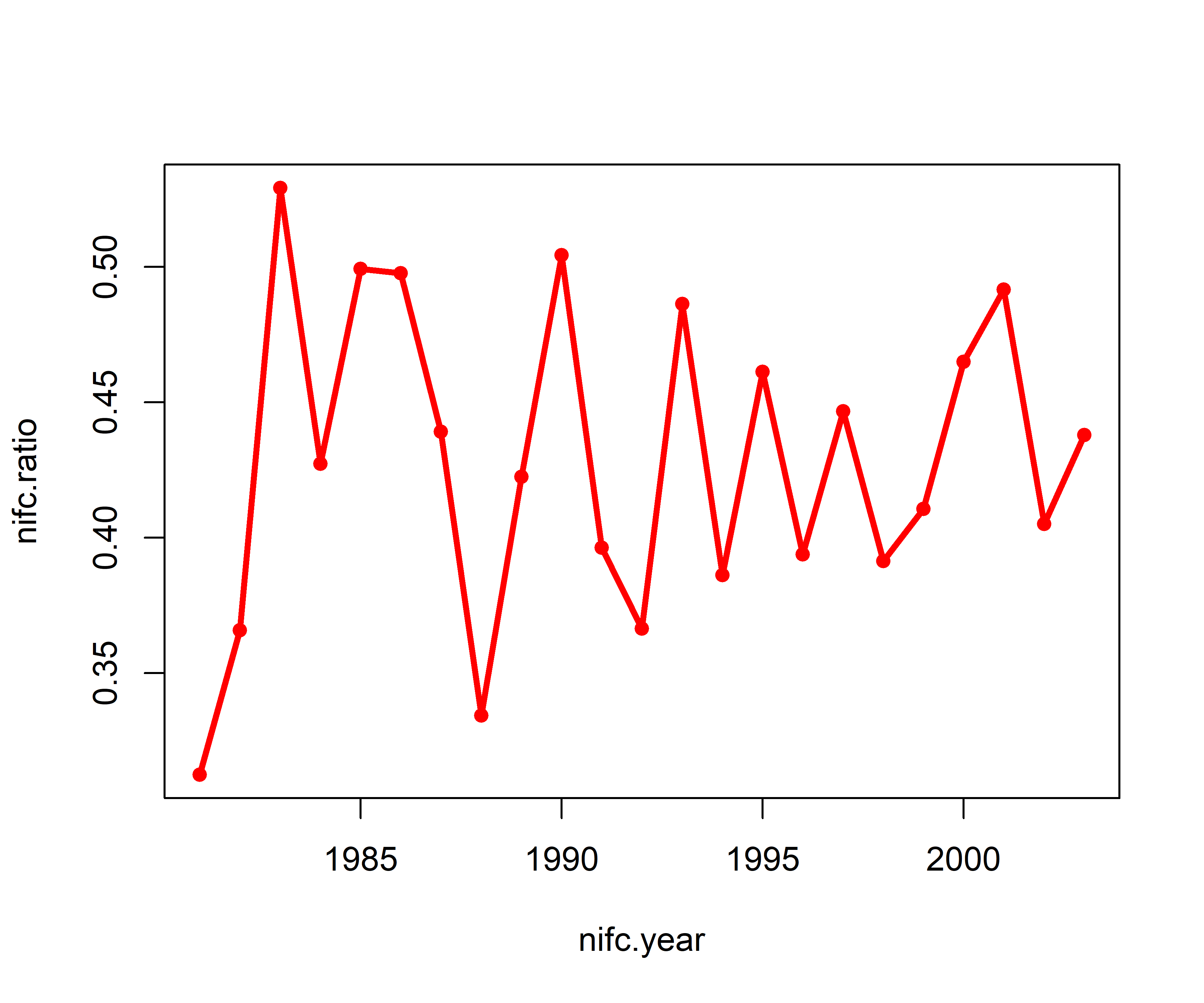 plot(nifc.year, nifc.ratio, pch=16, type="o", lwd=3, col="red")