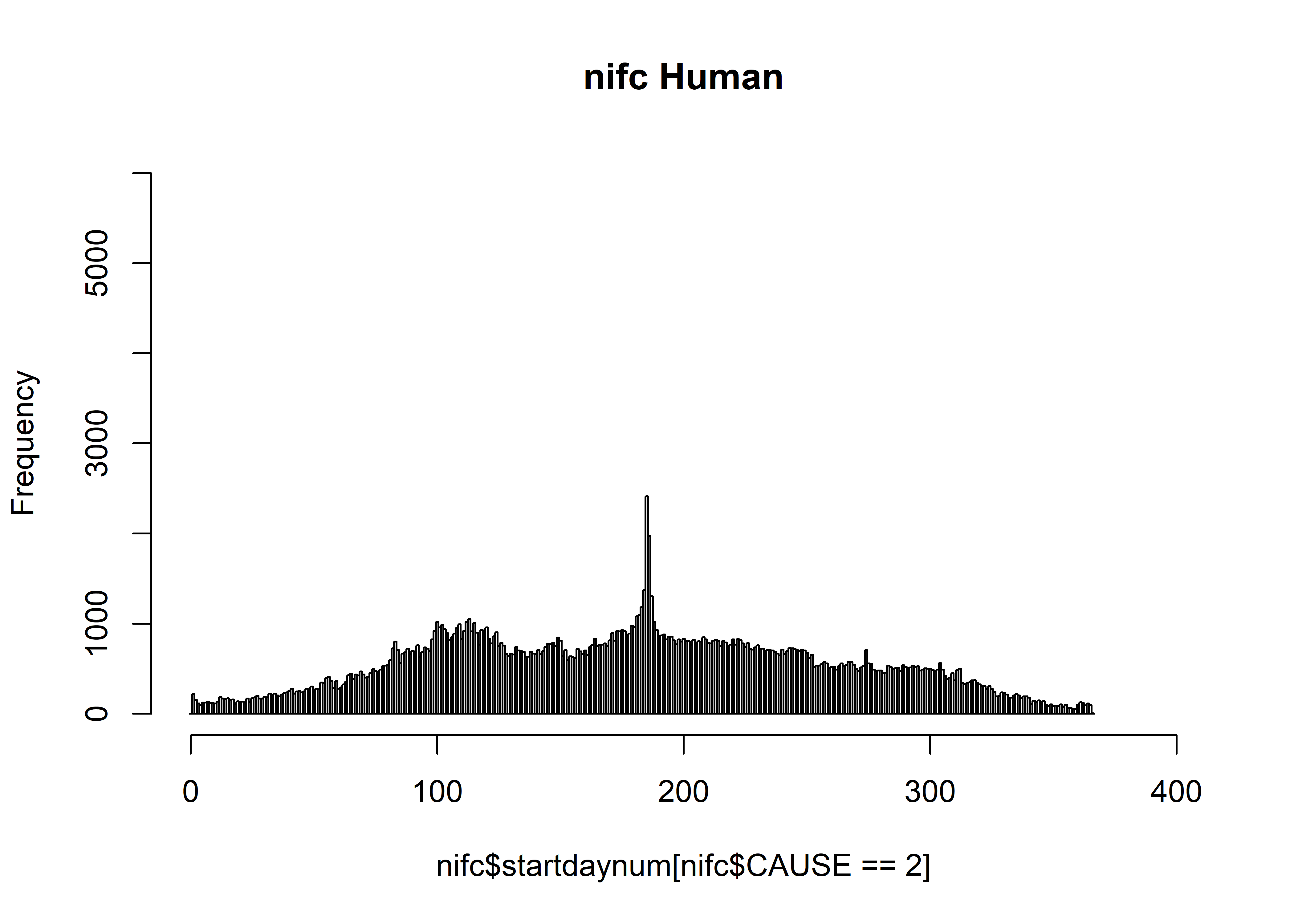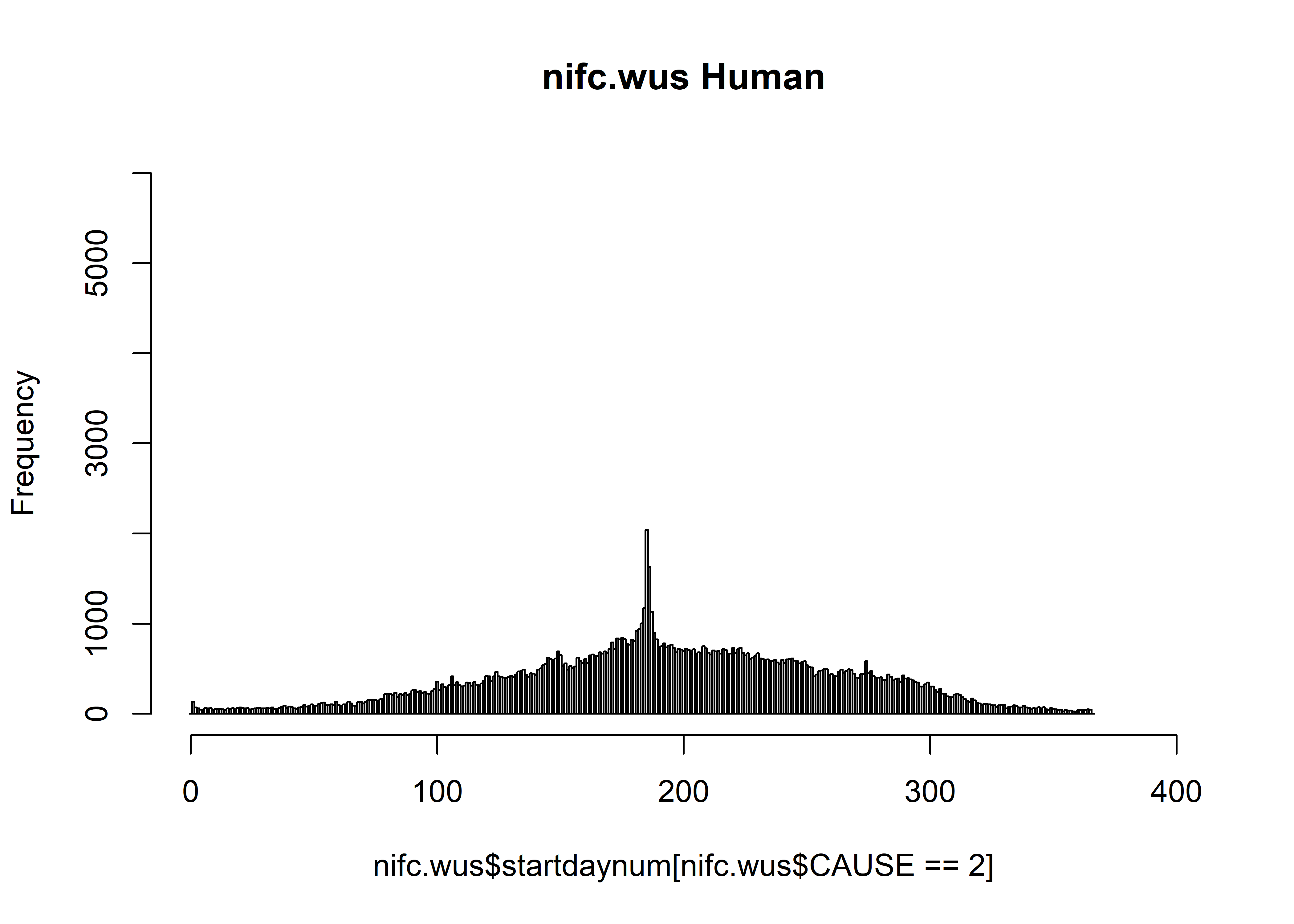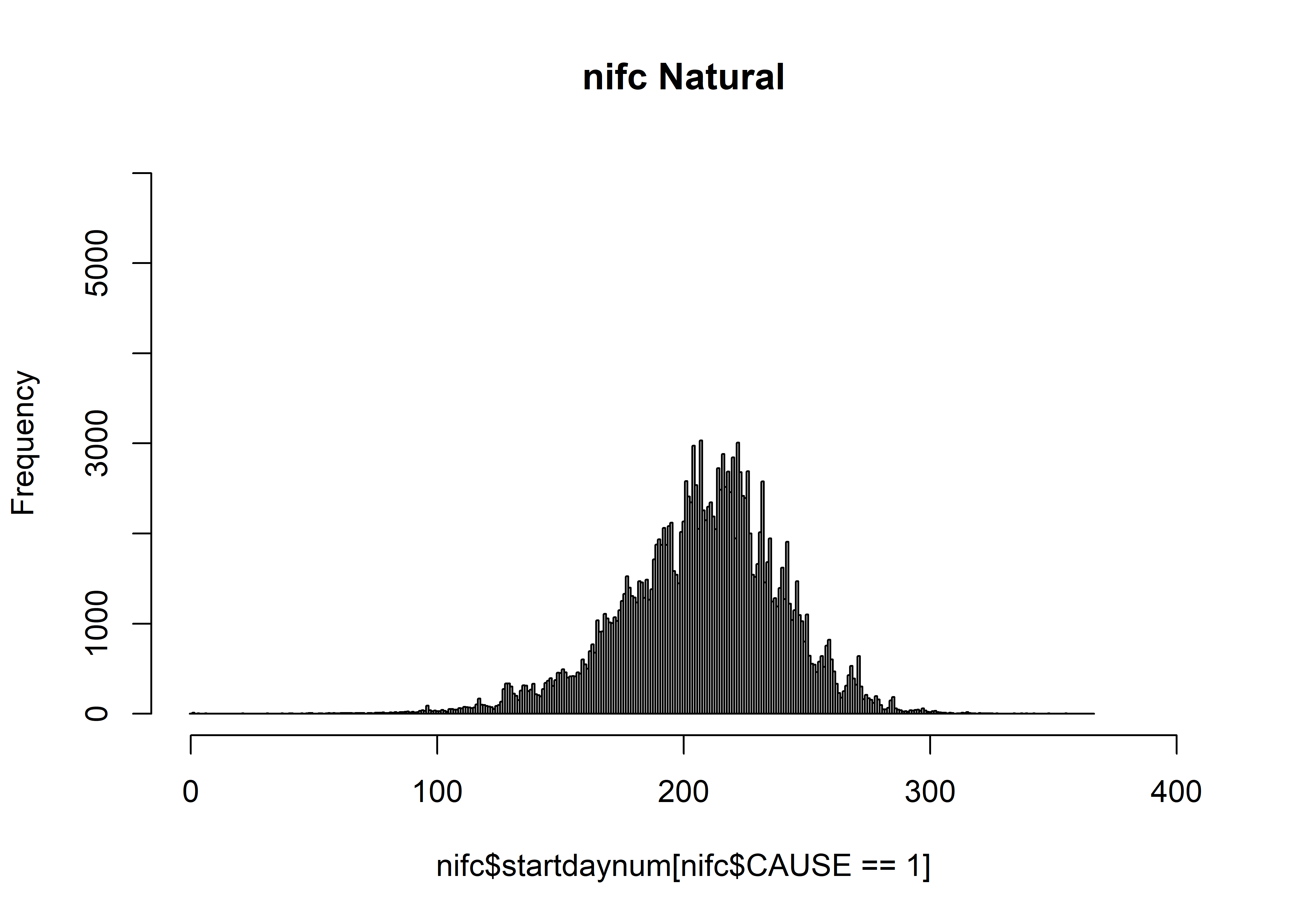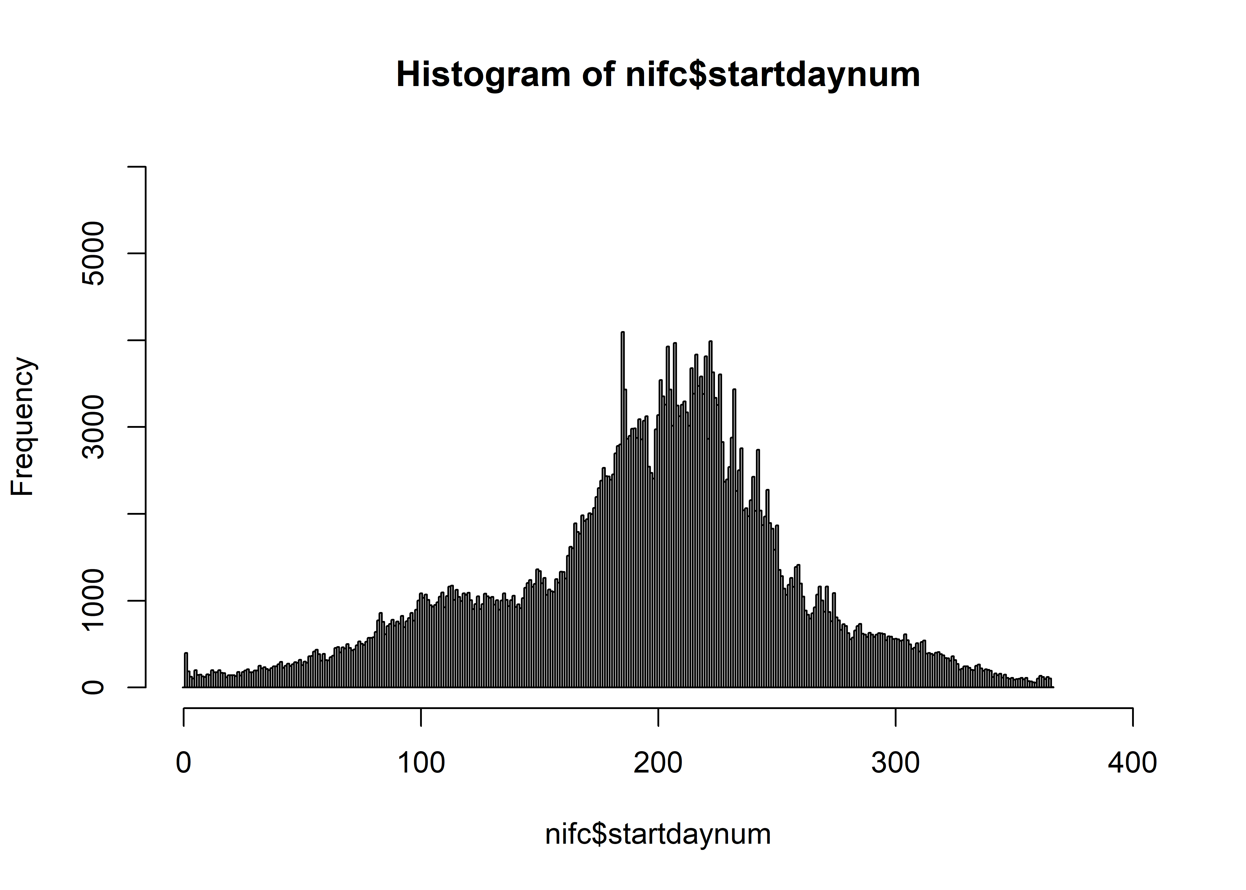 hist(nifc.wus$startdaynum, breaks=seq(-0.5,366.5,by=1), freq=-TRUE, ylim=c(0,6000), xlim=c(0,400))