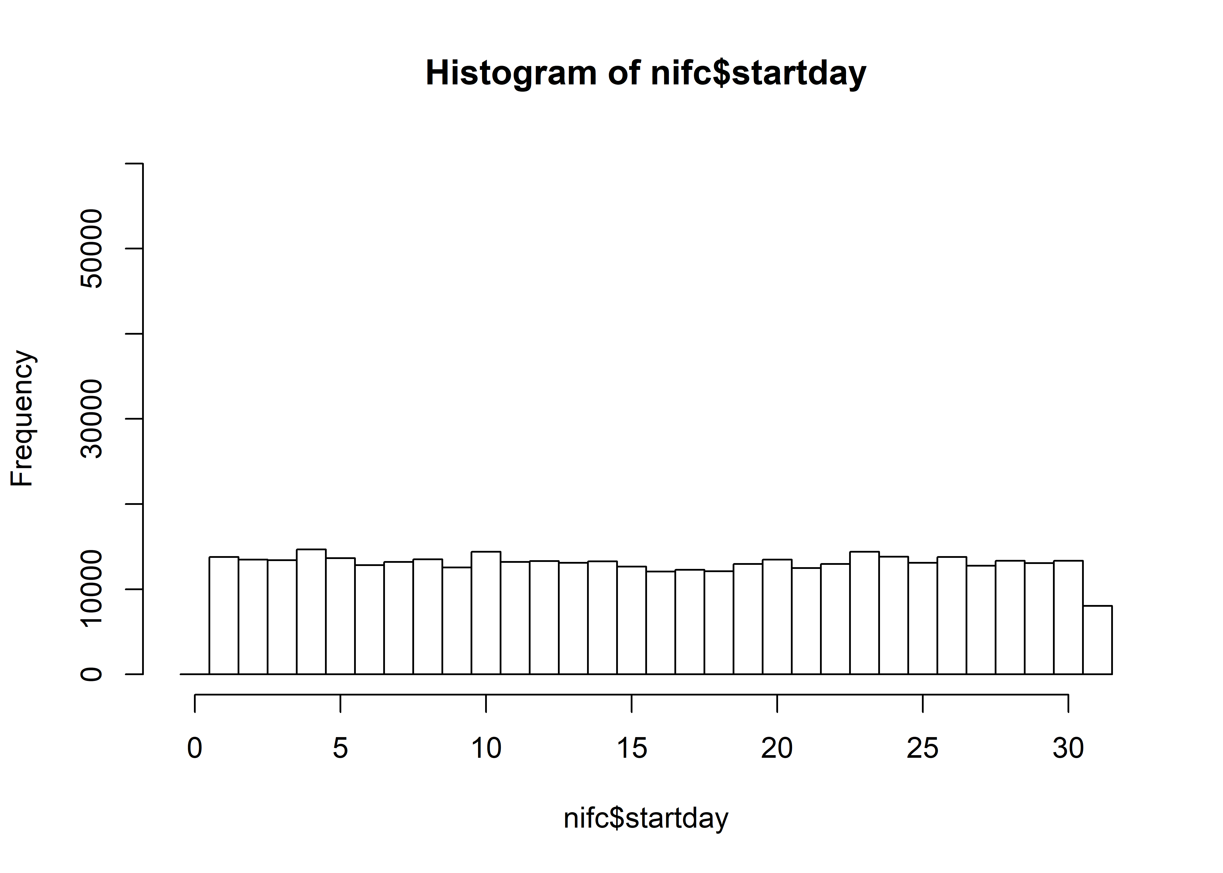 hist(nifc$startday, breaks=seq(-0.5,31.5,by=1), freq=-TRUE, ylim=c(0,60000))