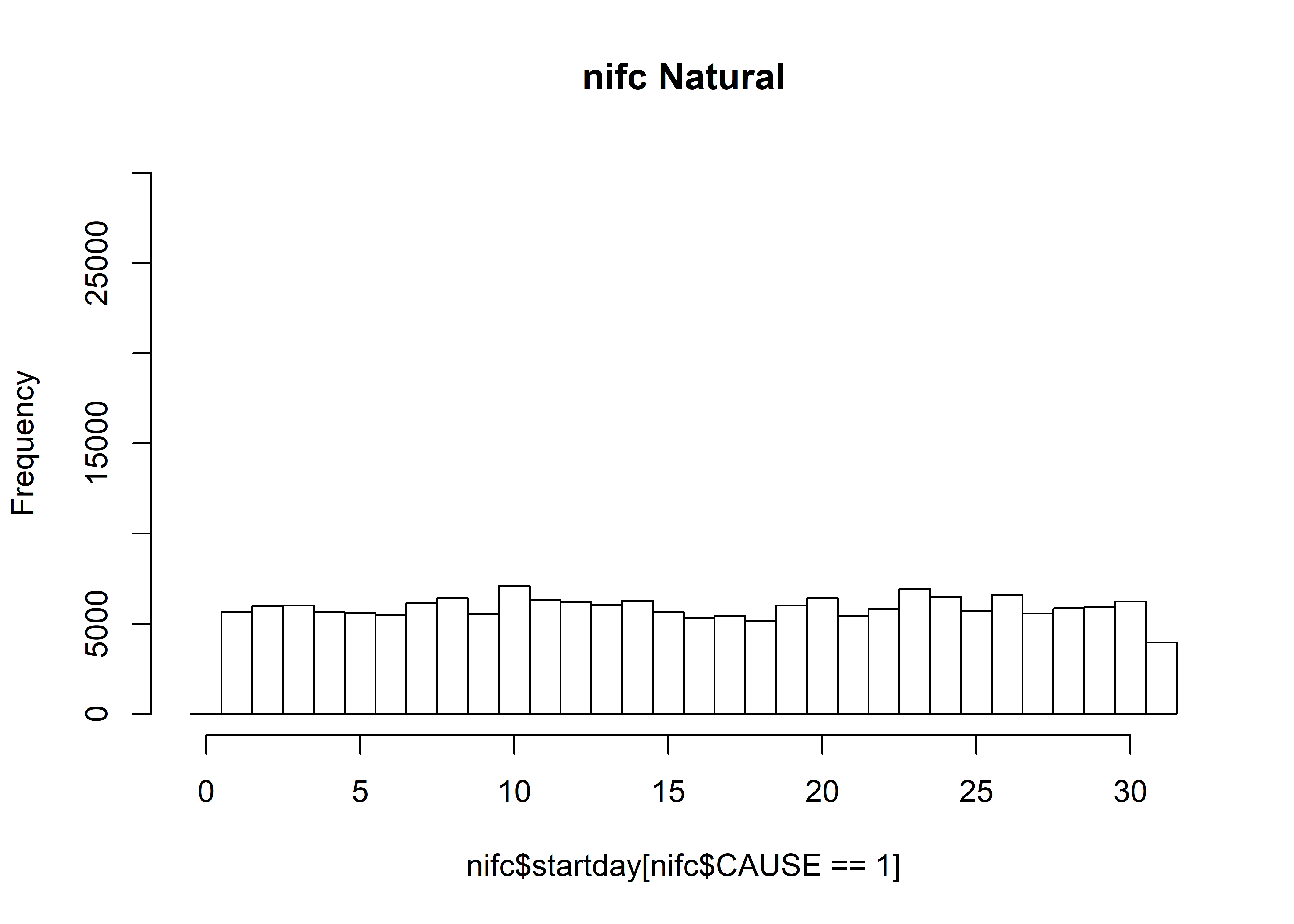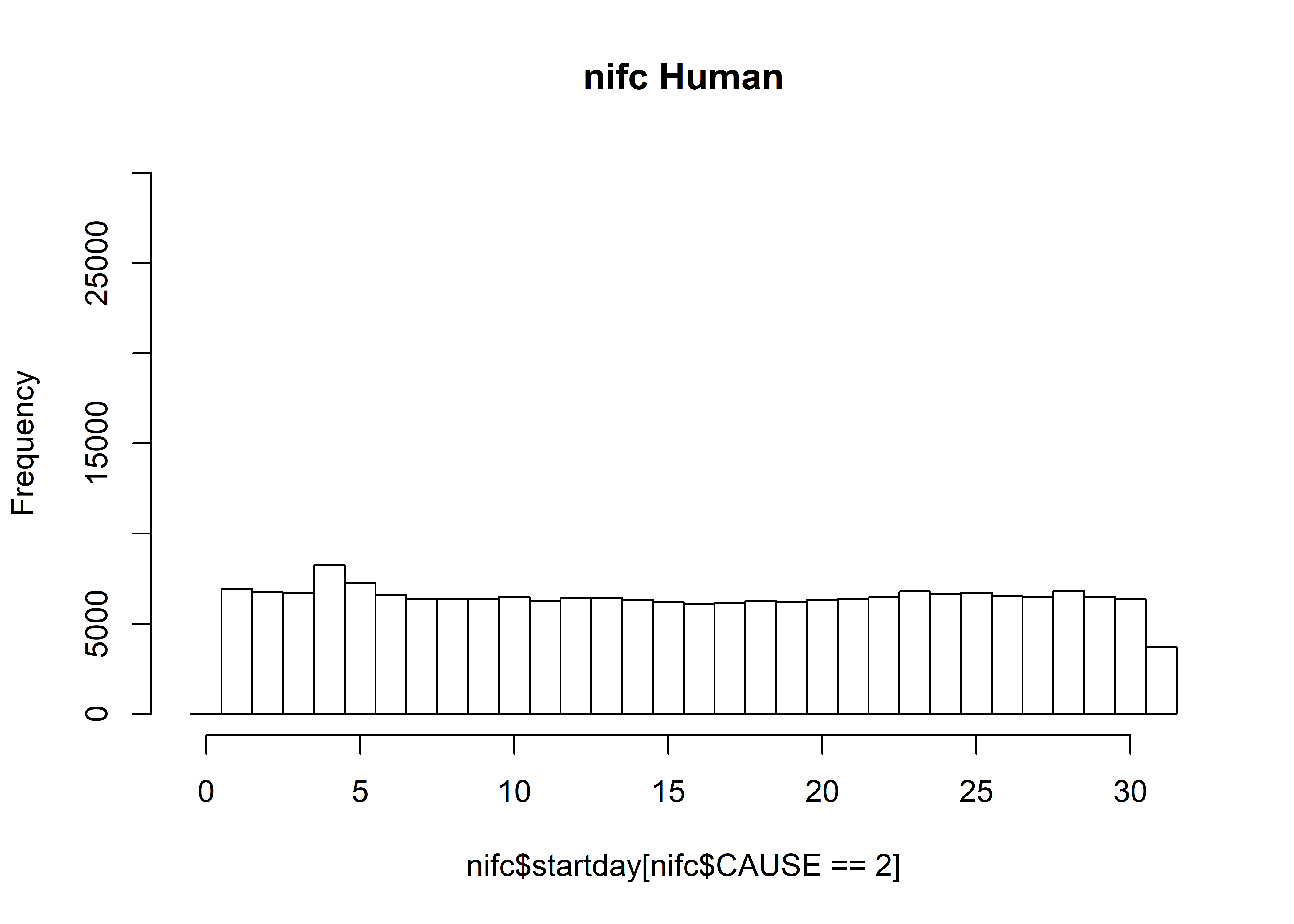 hist(nifc$startday[nifc$CAUSE==1], breaks=seq(-0.5,31.5,by=1), freq=-TRUE, ylim=c(0,30000),
