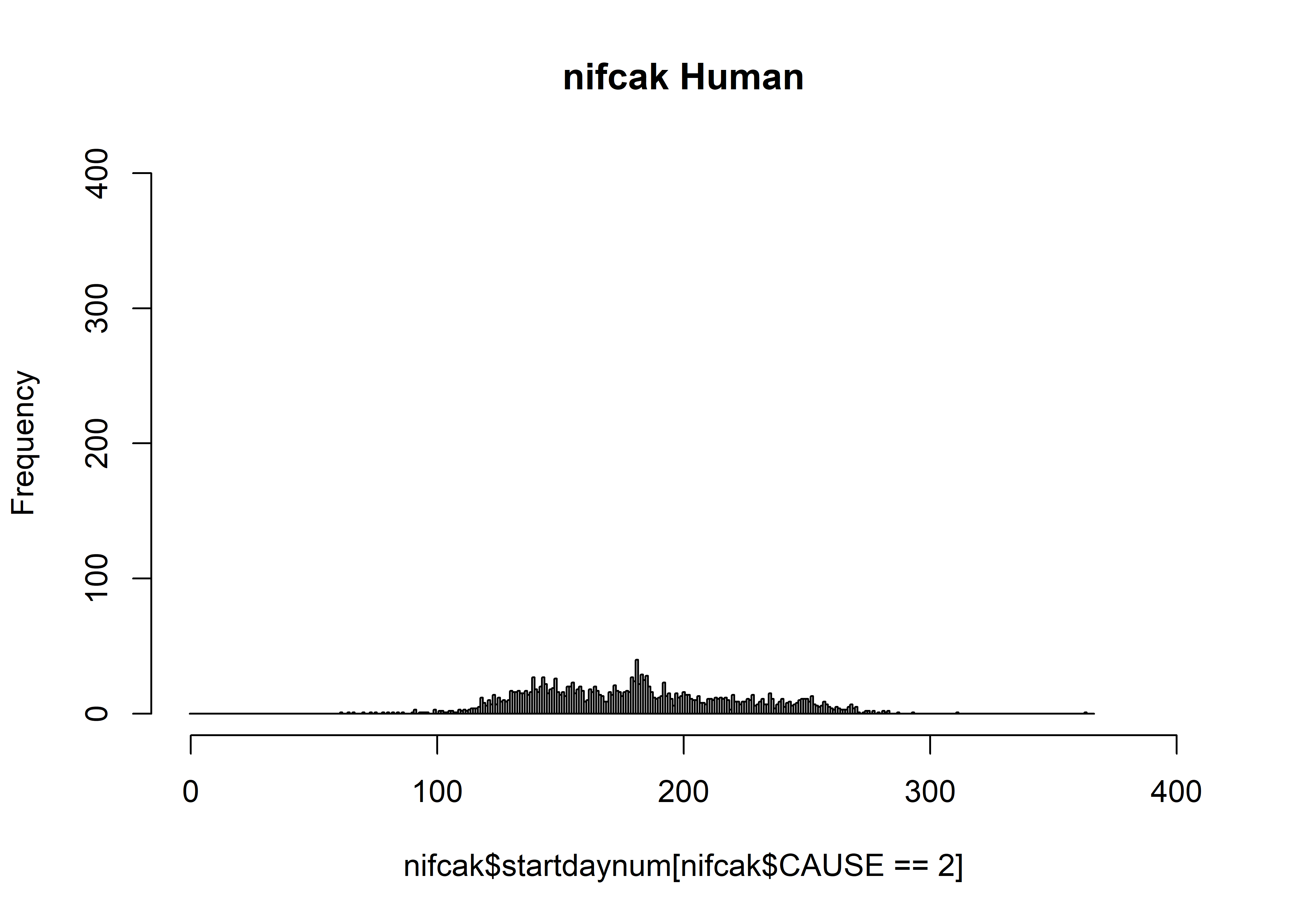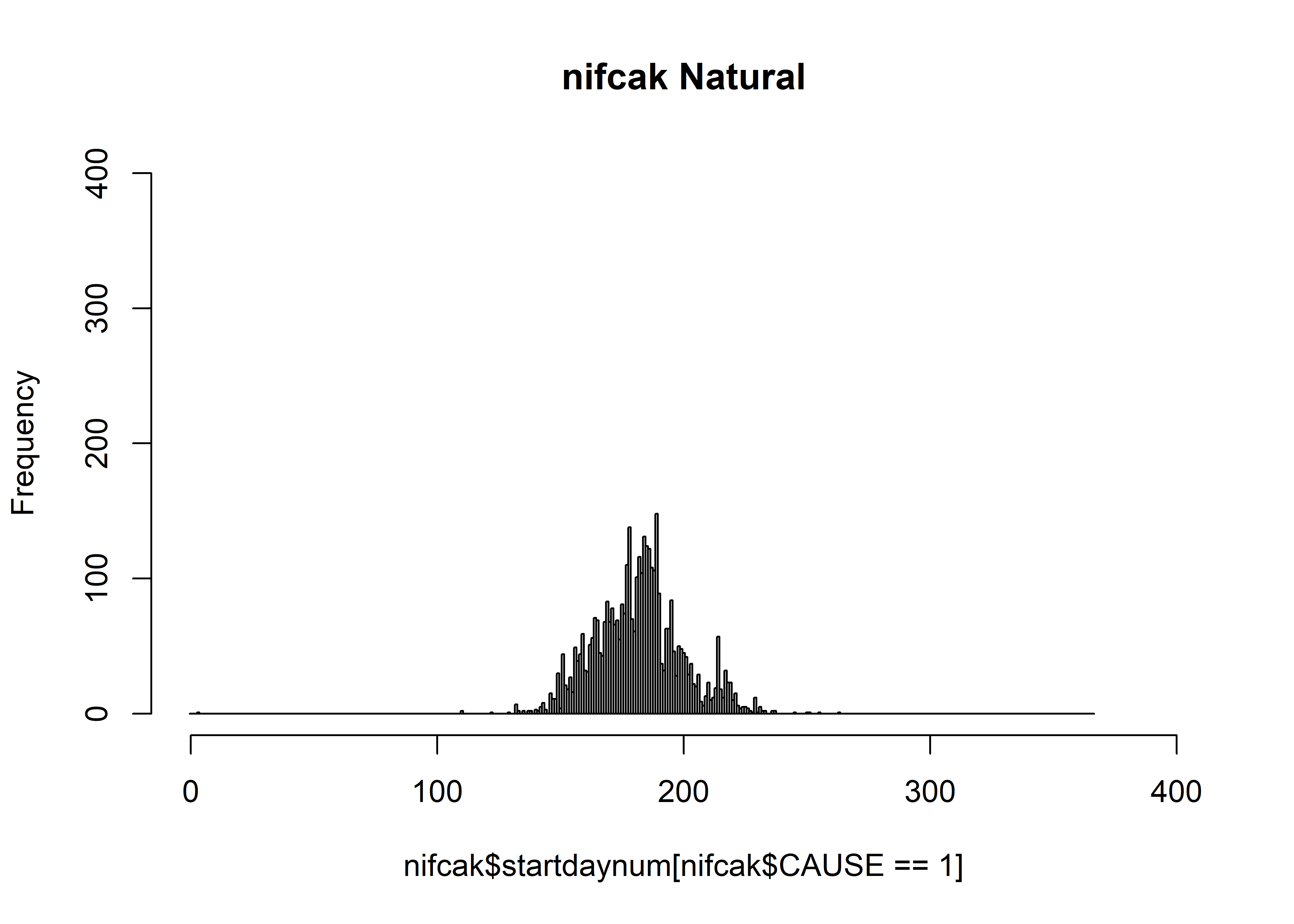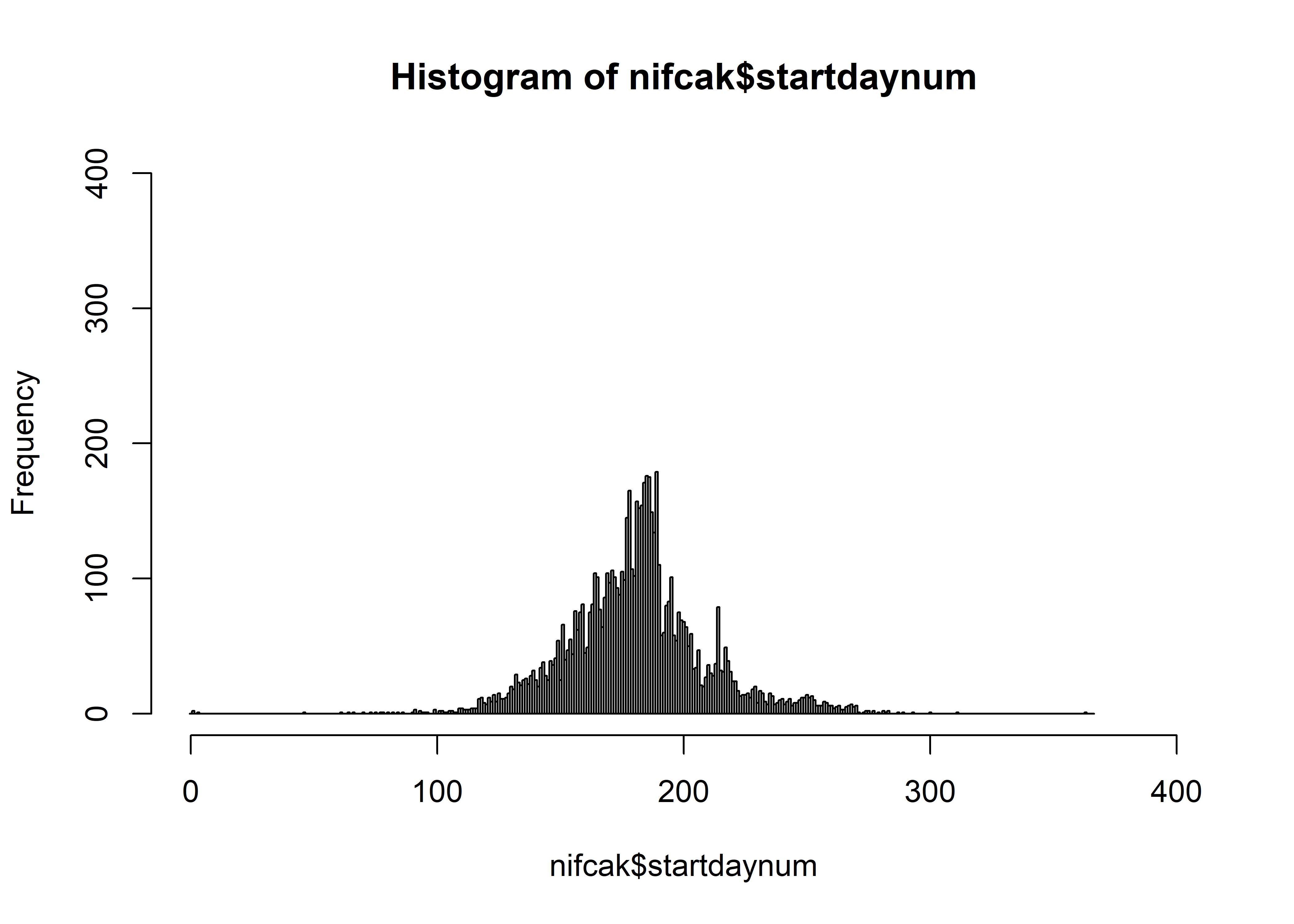 hist(nifcak$startdaynum[nifcak$CAUSE==2], breaks=seq(-0.5,366.5,by=1), freq=-TRUE,