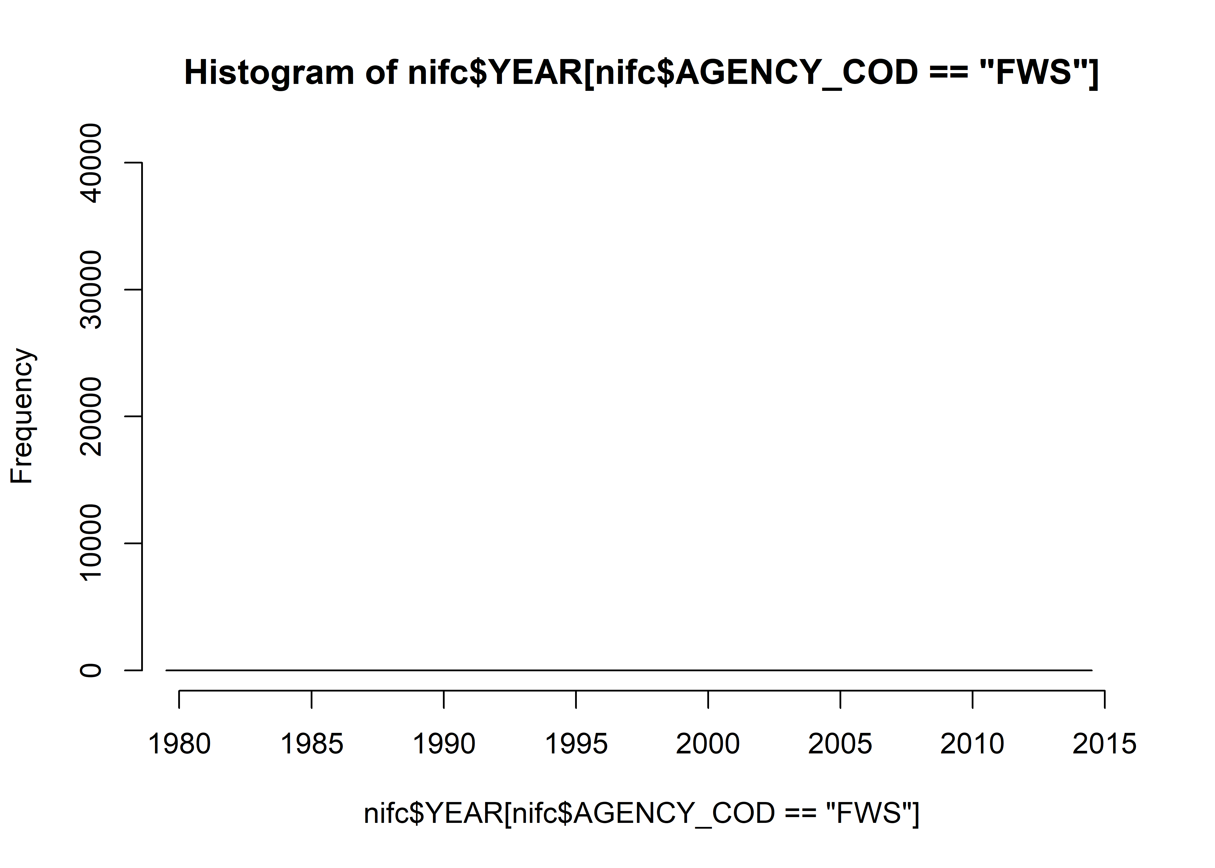 hist(nifc$YEAR[nifc$AGENCY_COD =="FWS"], xlim=c(1980,2015), ylim=c(0,40000),