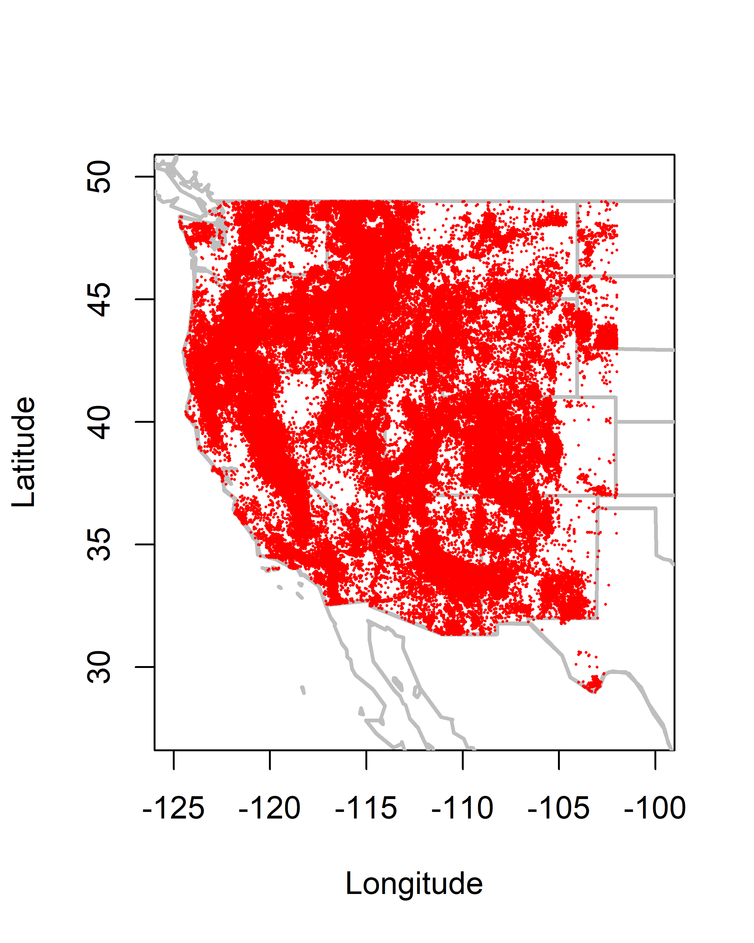 plot(nifc.wus$LATITUDE ~ nifc.wus$LONGITUDE, ylim=c(27.5,50), xlim=c(-125,-100), type="n",