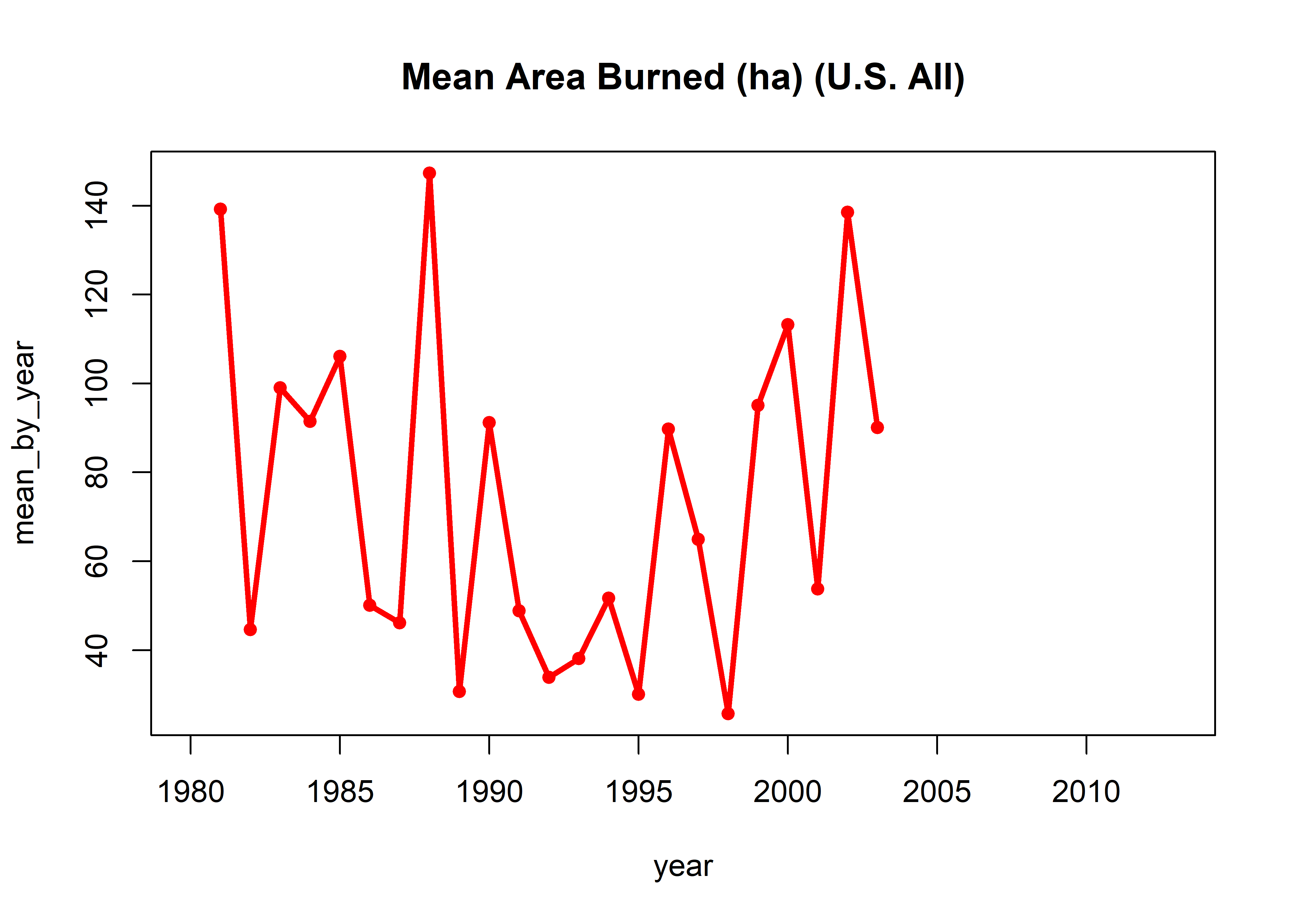 size.year <- na.omit(cbind(nifc$AREA,nifc$YEAR))
