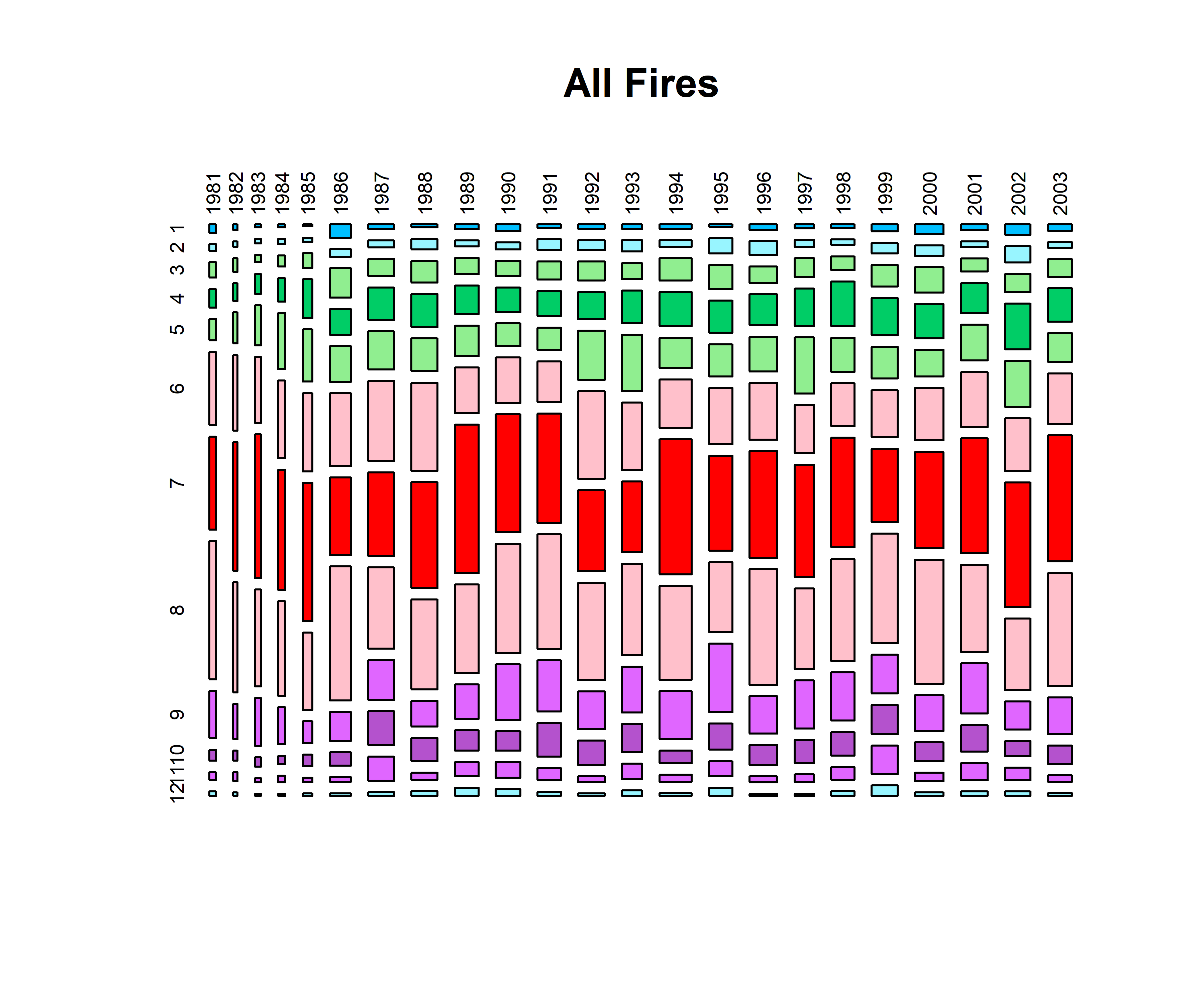 mosaicplot(nifc.tablemon, color=monthcolors, cex.axis=0.6, las=3, main="All Fires")