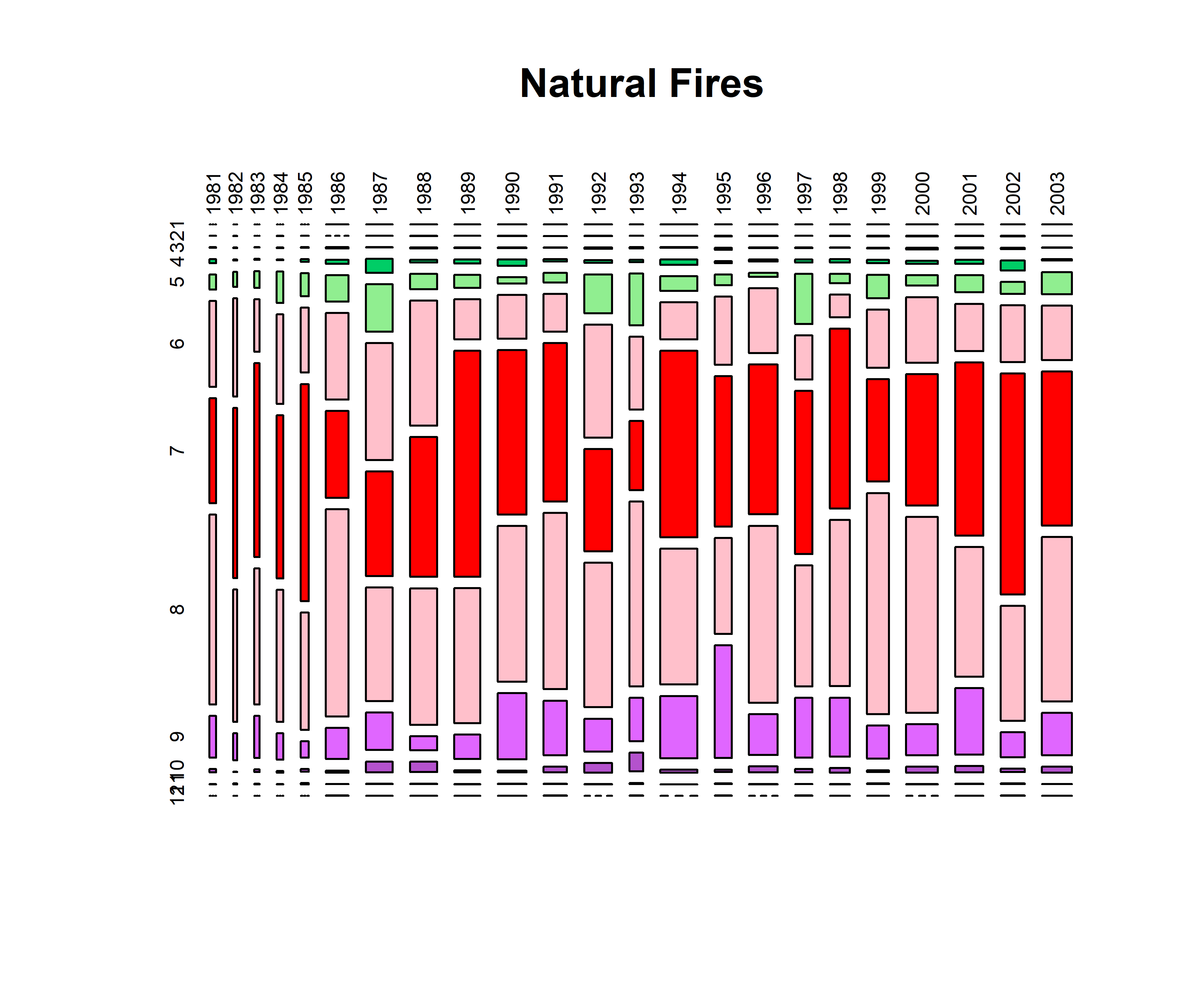 mosaicplot(nifc.tablemon.n, color=monthcolors, cex.axis=0.6, las=3, main="Natural Fires")