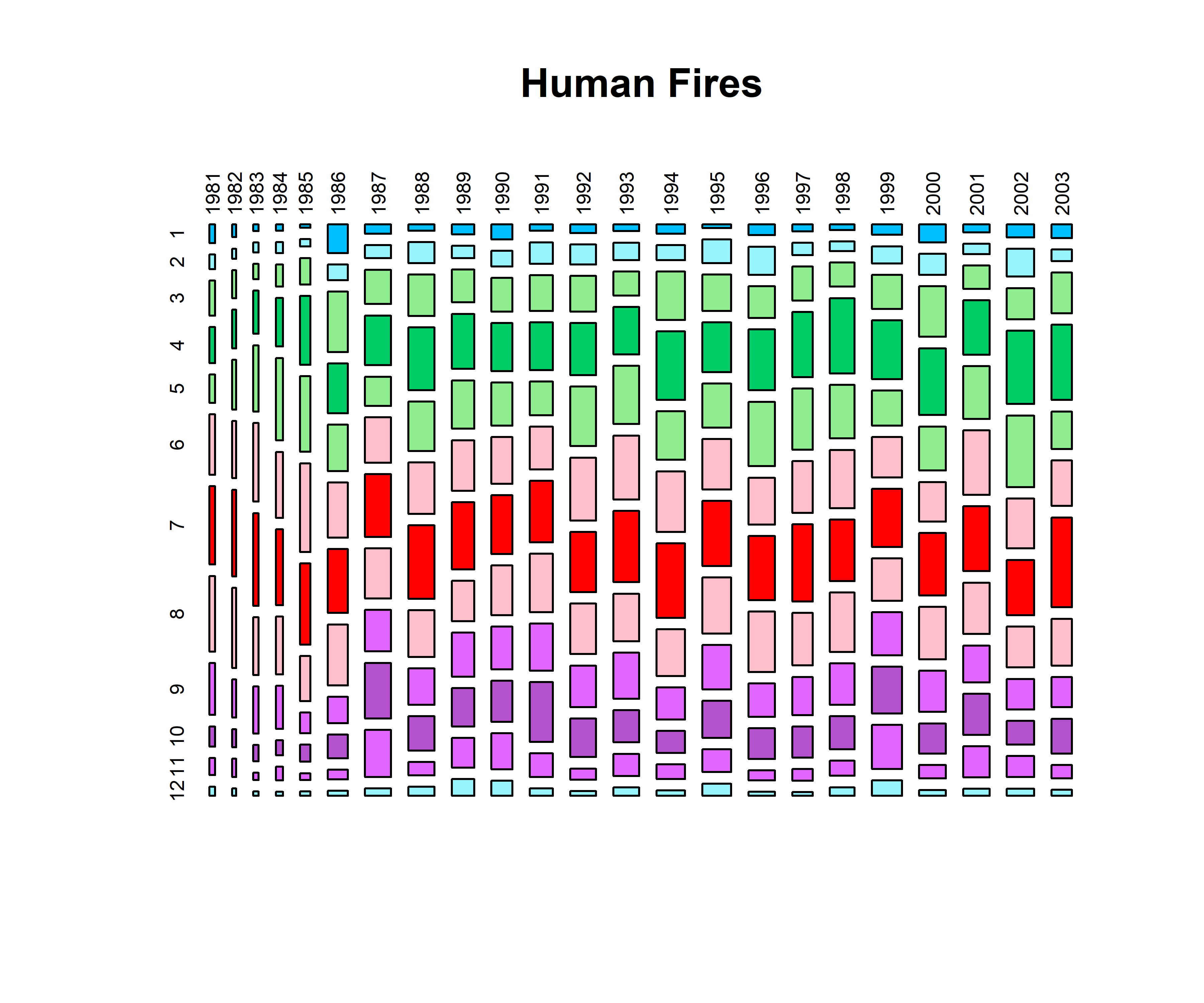 mosaicplot(nifc.tablemon.h, color=monthcolors, cex.axis=0.6, las=3, main="Human Fires")