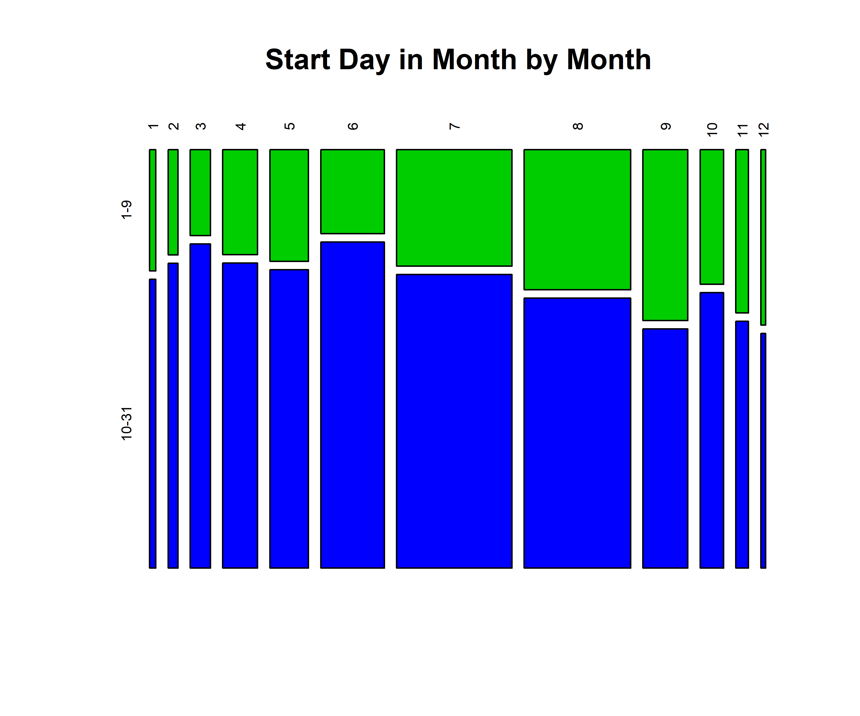 mosaicplot(nifc.table.start, color=c(3,4), cex.axis=0.6, las=3, main="Start Day in Month by Month")