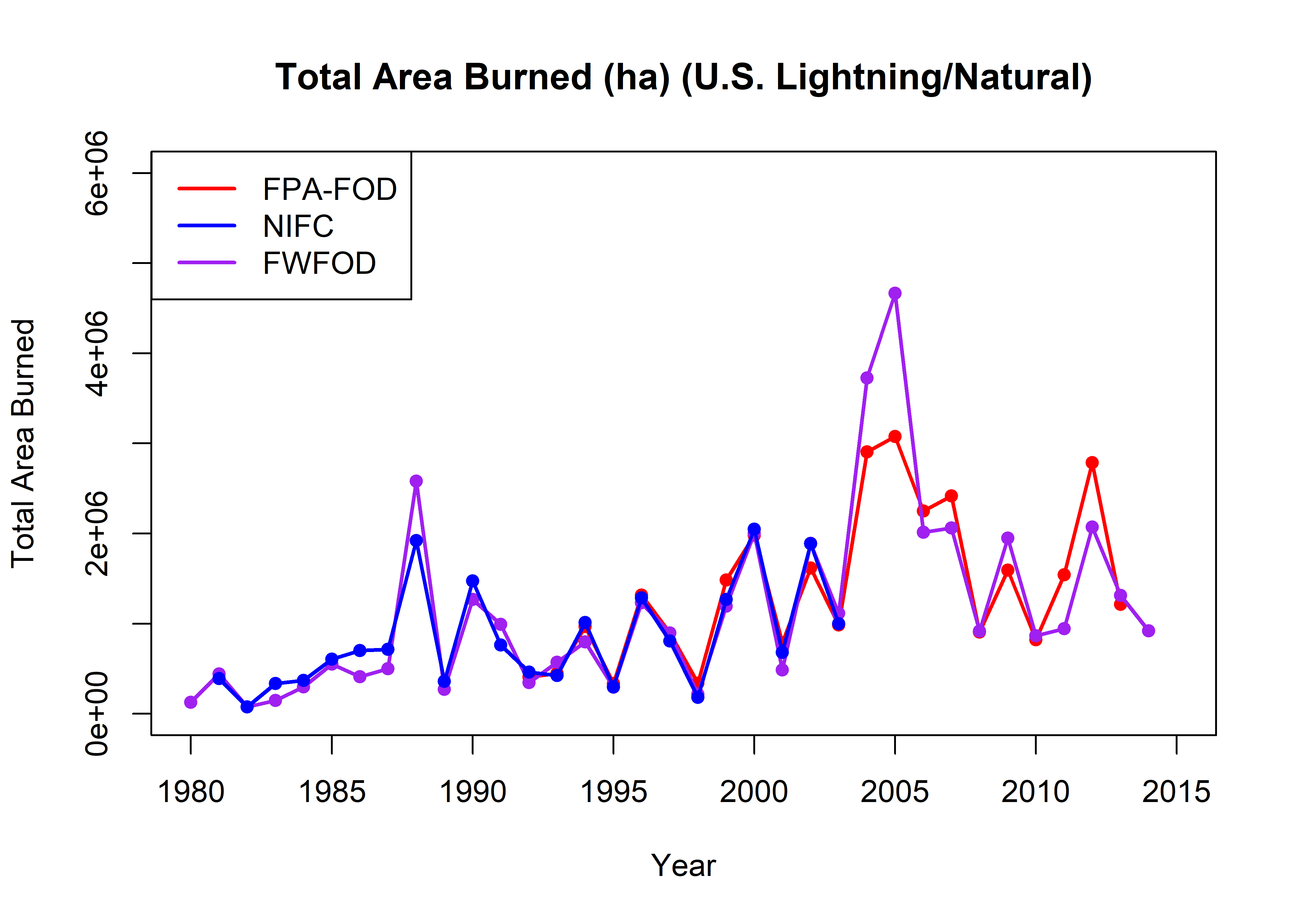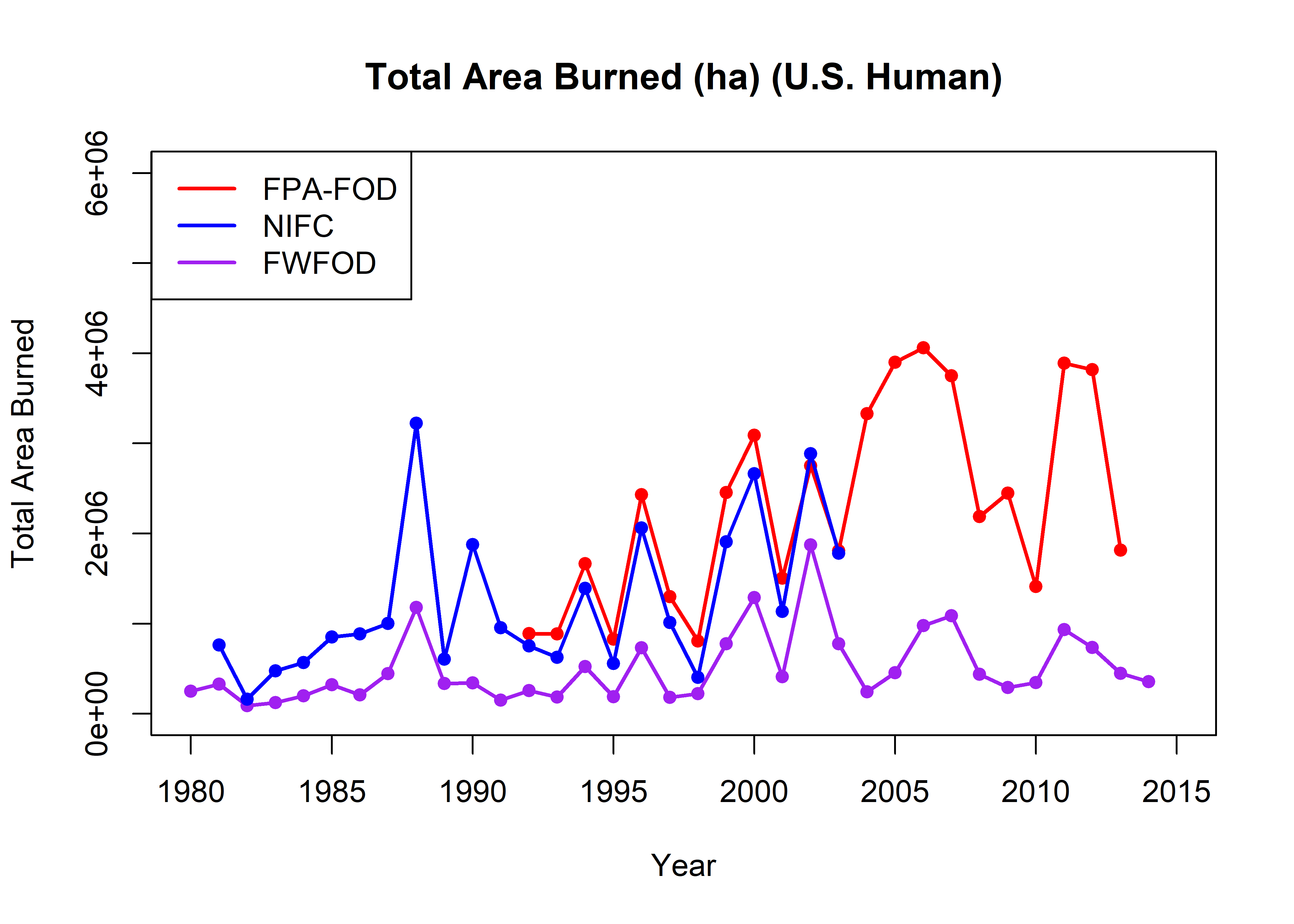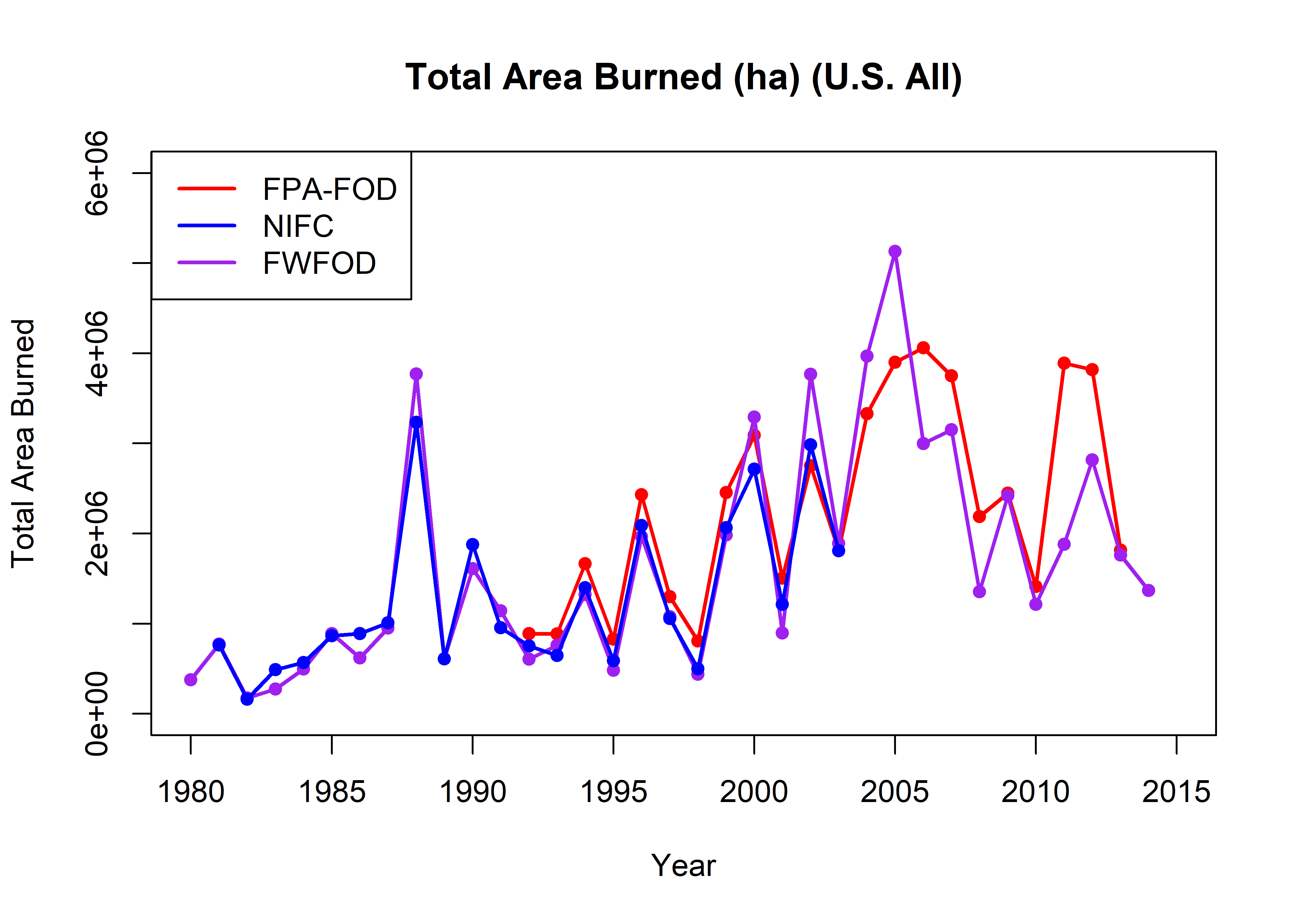 names(all_totalarea) <- c("Year", "fpafod_totalarea", "nifc_totalarea", "fwfod_totalarea")