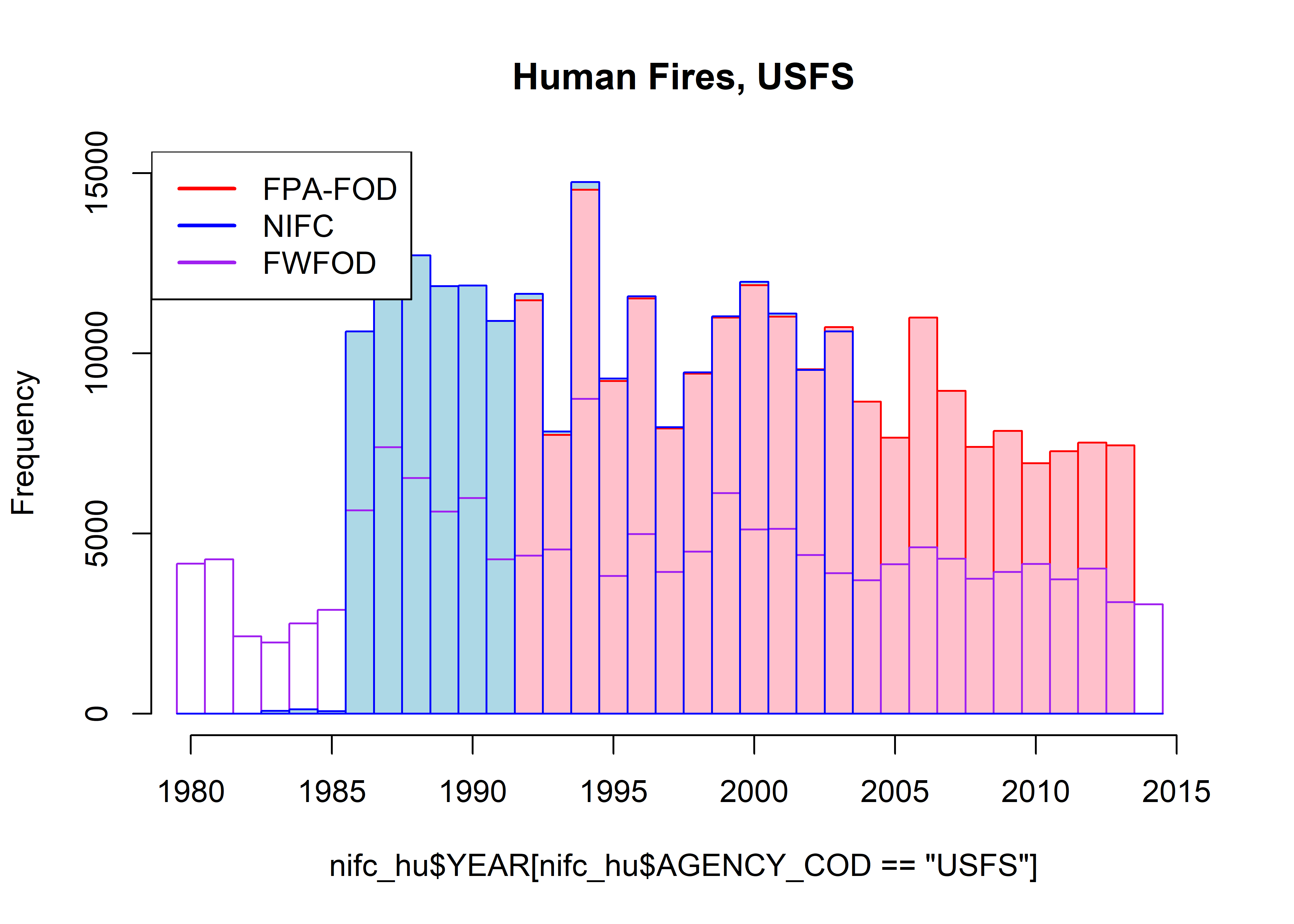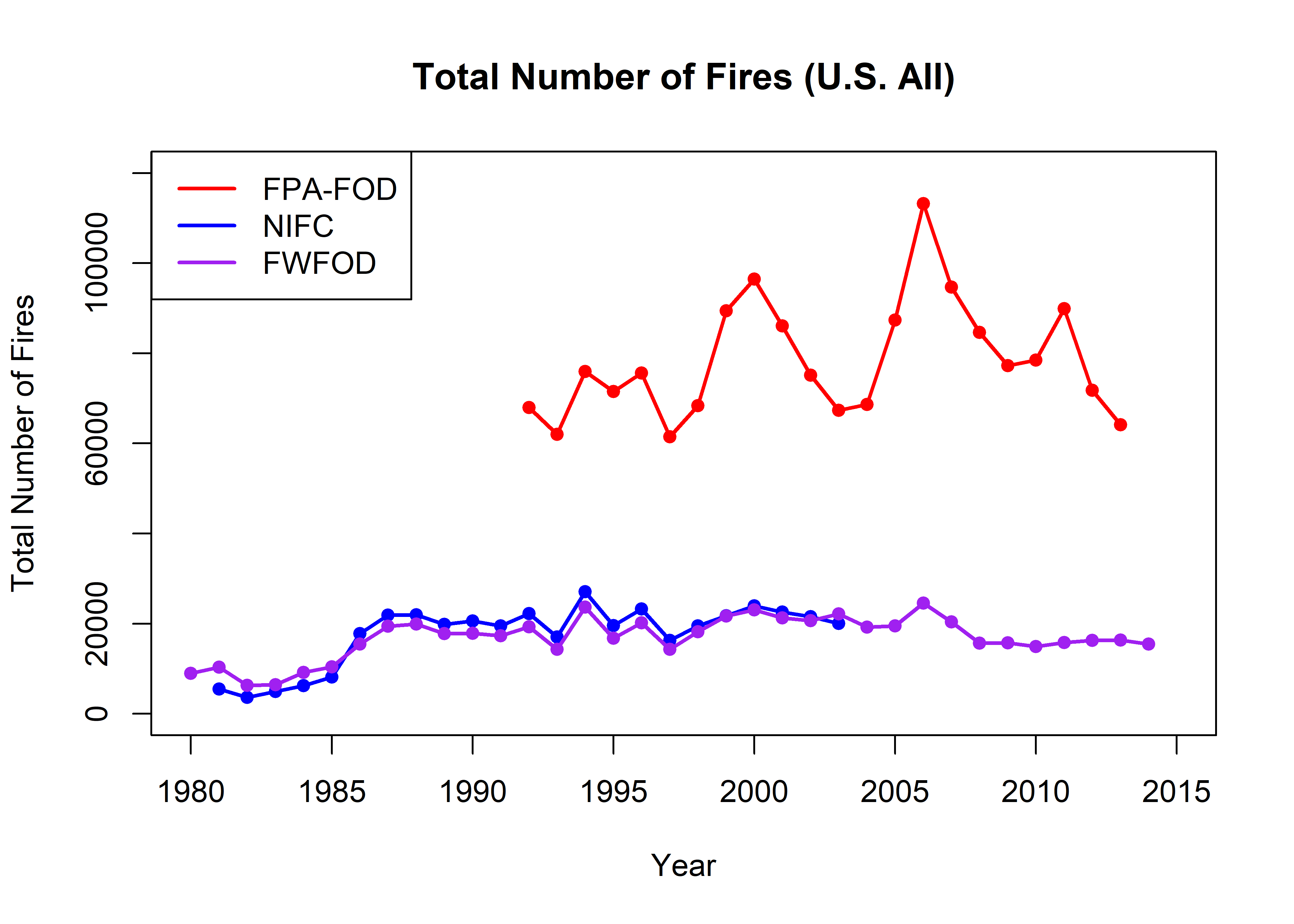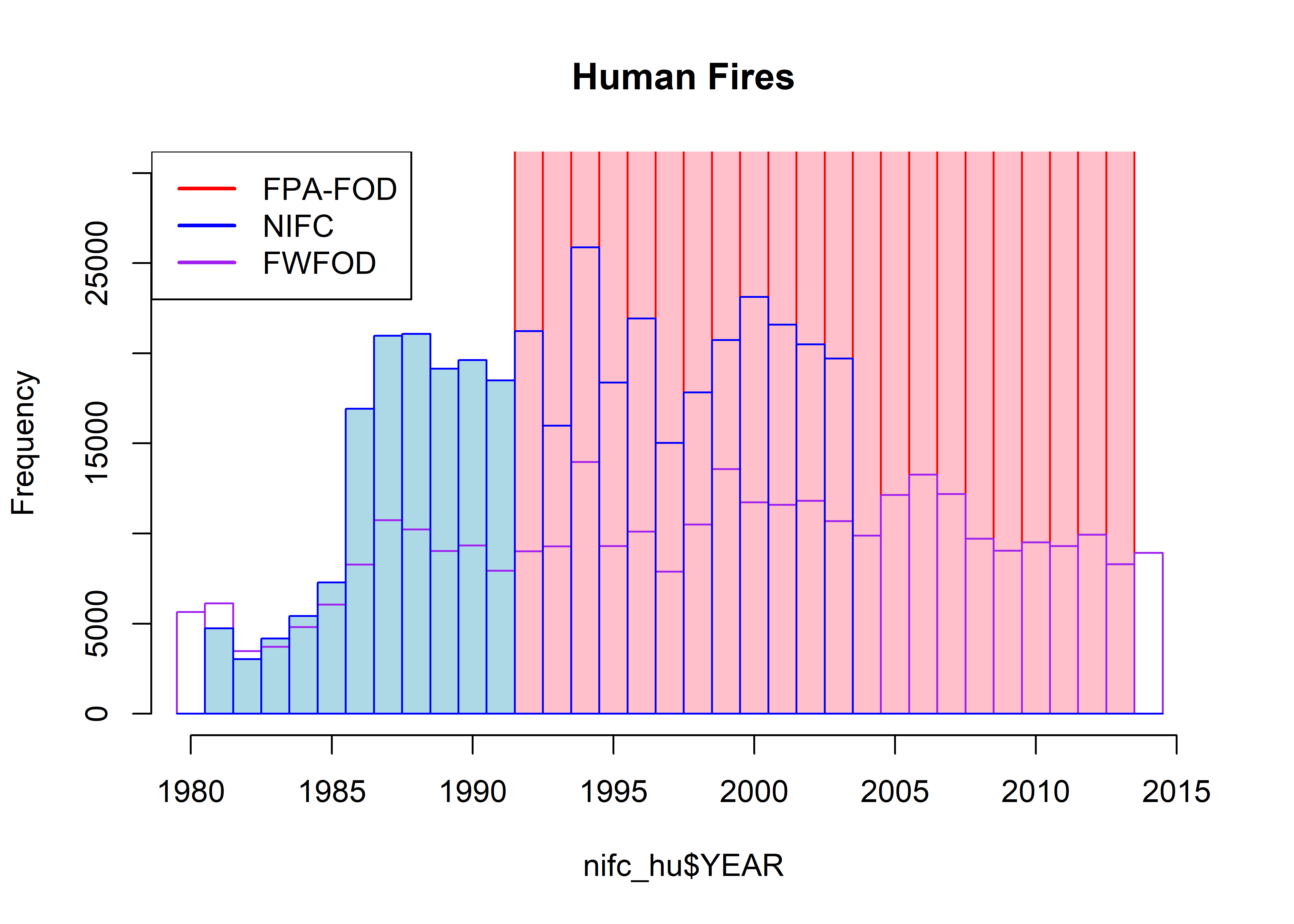 par(oldpar)The FPA-FOD data set can clearly be seen to have many more fires per year than the FWFOD and NIFC data sets, and the FPA-FOD also shows larger-amplitude interannual variability. As will be discussed further below, this can be attributed to the greater number of human-started fires in the FPA-FOD data set. When they overlap, the NIFC and FWFOD data sets are highly correlated (r = 0.9626519)