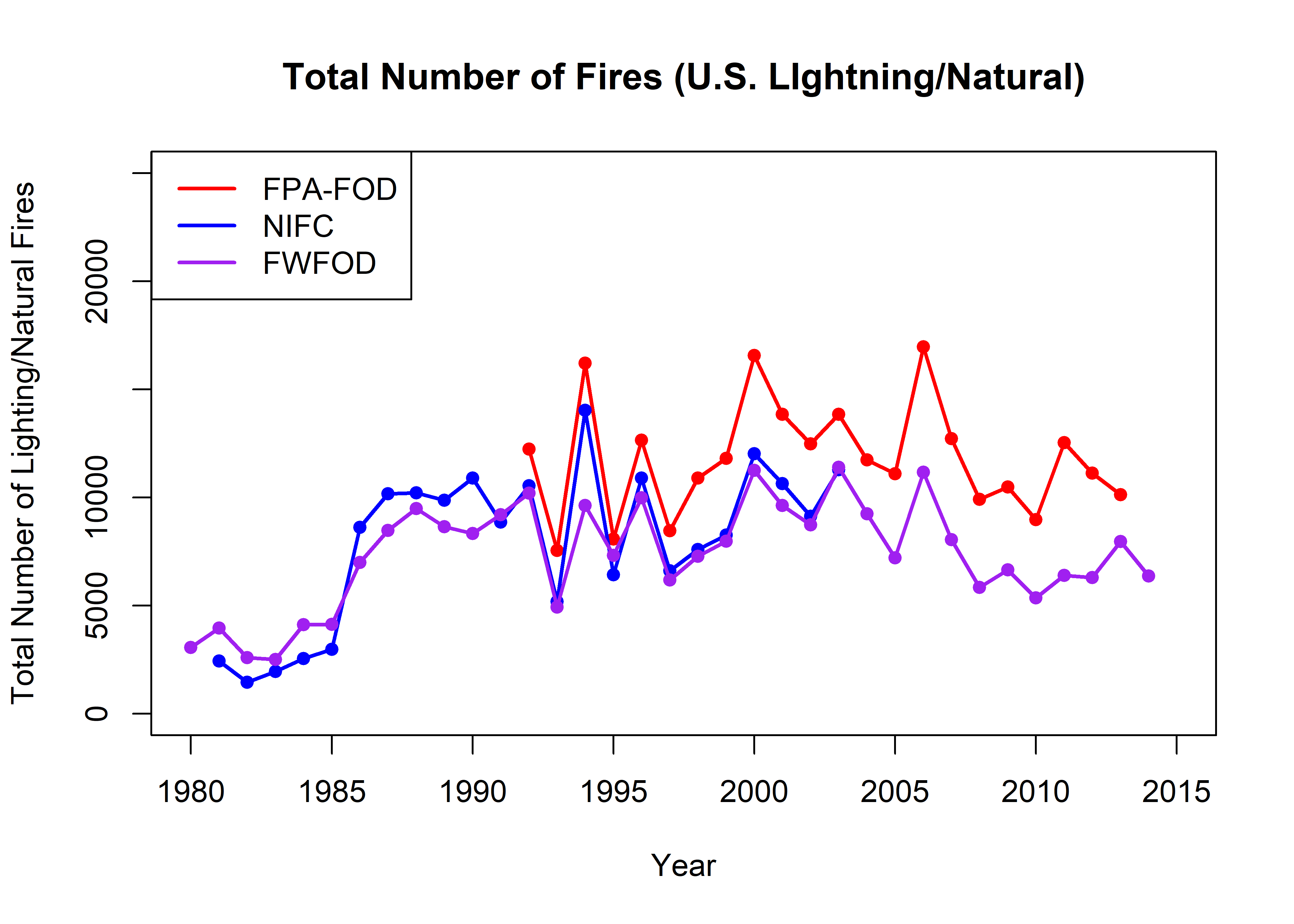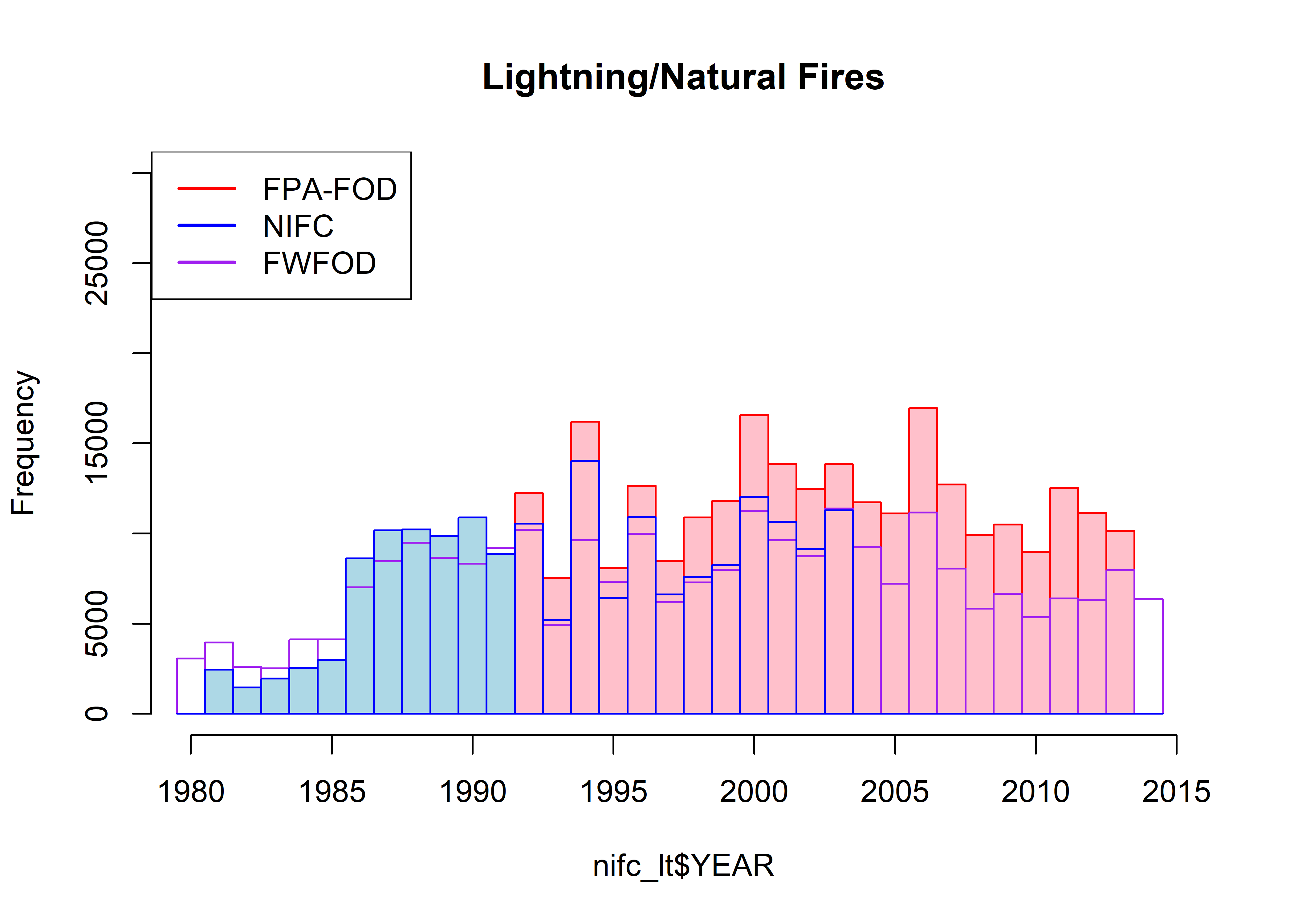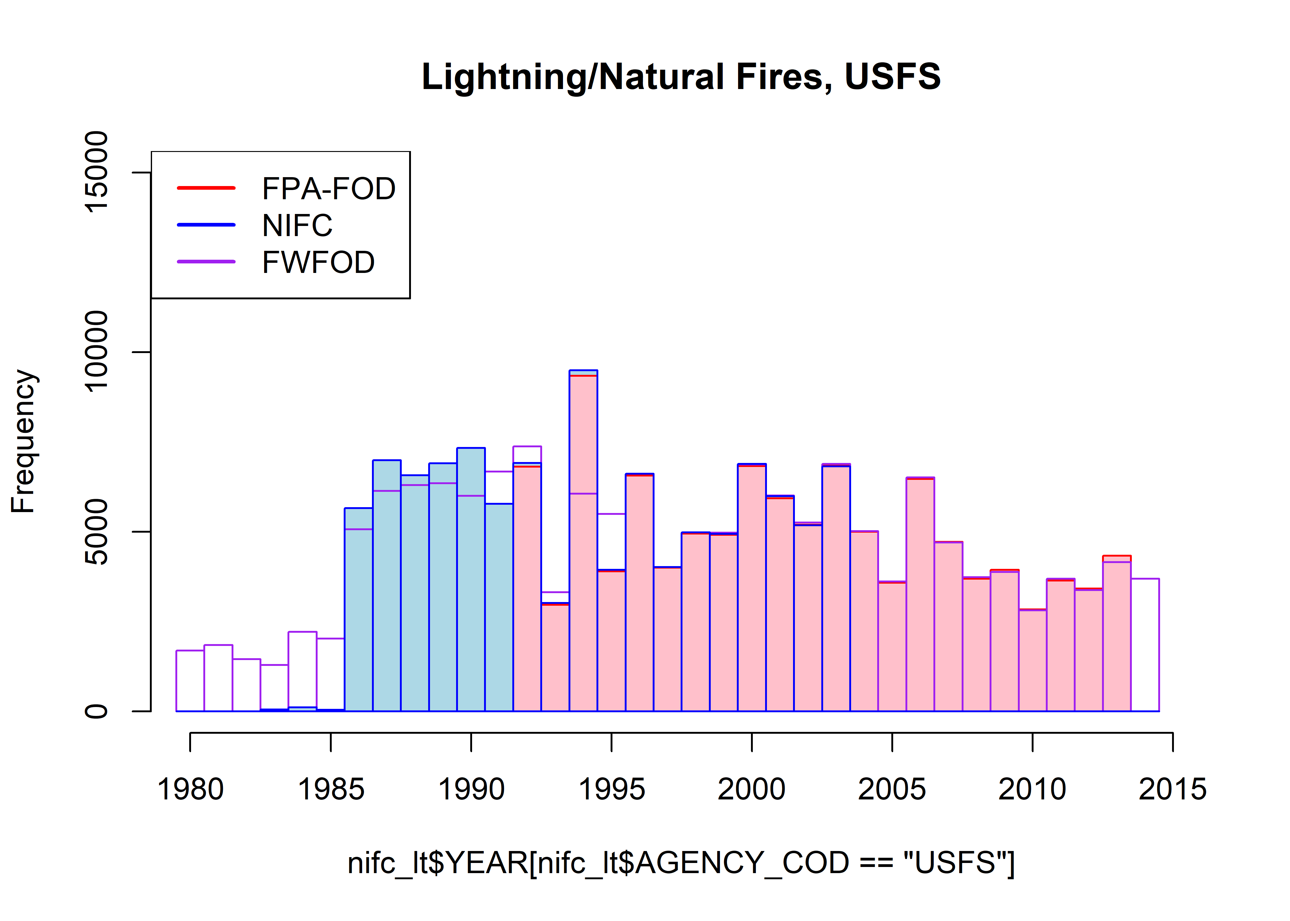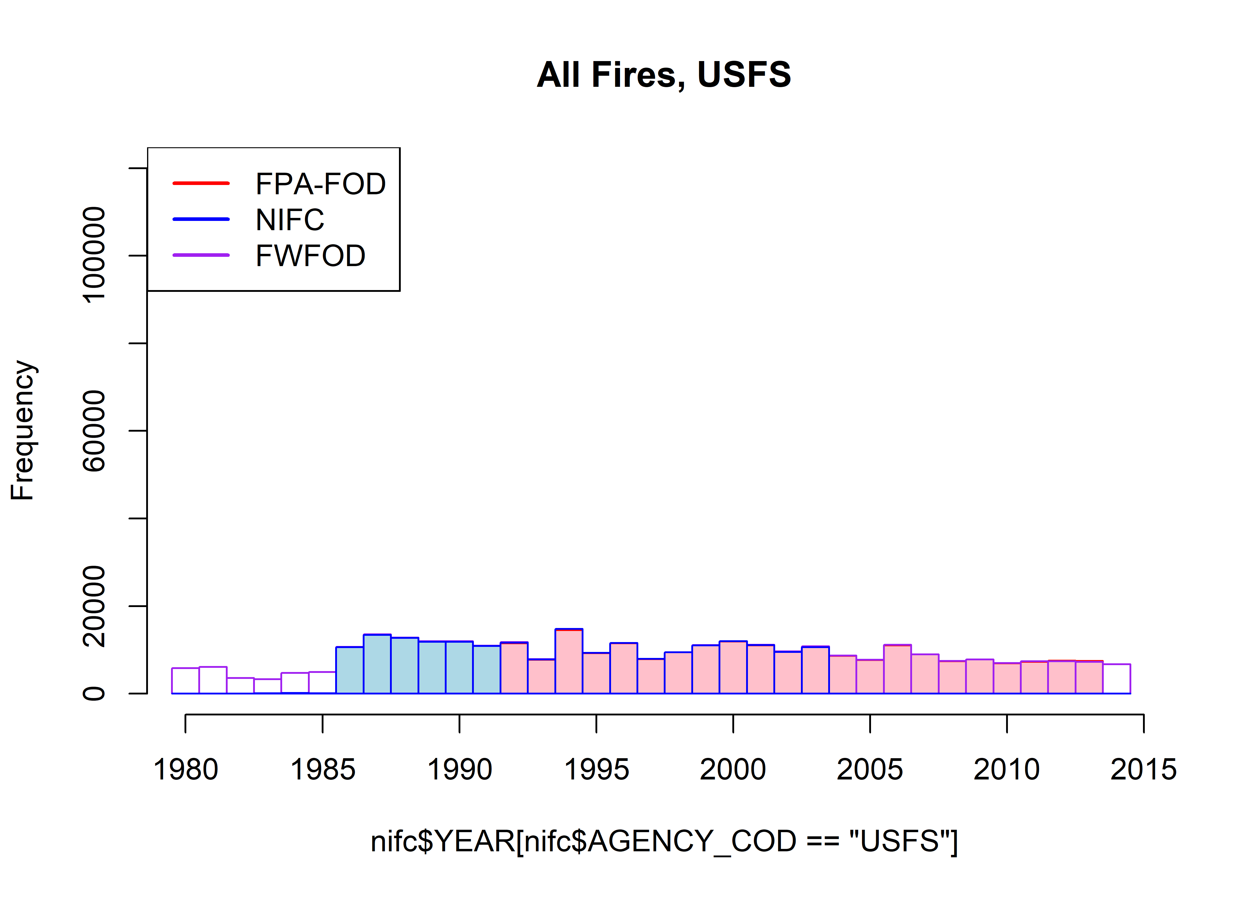 par(oldpar)The FPA-FOD data set can clearly be seen to have many more fires per year than the FWFOD and NIFC data sets, and the FPA-FOD also shows larger-amplitude interannual variability. As will be discussed further below, this can be attributed to the greater number of human-started fires in the FPA-FOD data set. When they overlap, the NIFC and FWFOD data sets are highly correlated (r = 0.9626519)