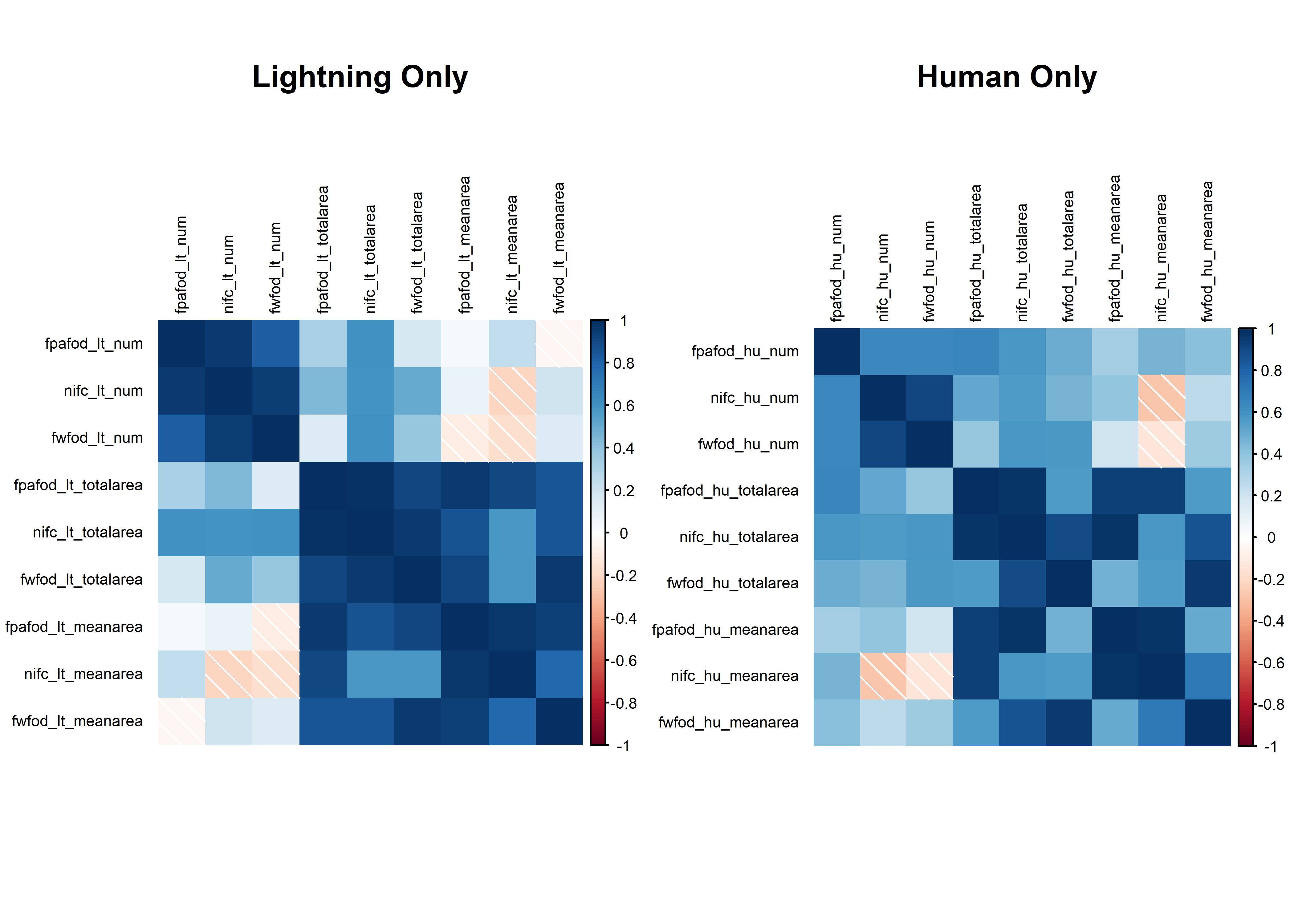 Overall, the annual values NIFC total area burned and mean area burned data are better correlated with the FPA-FOD across all, lightning-started and human-started fires and show similar or lower biases relative to the FPA-FOD data than do the FWFOD data. In the case of numbers of fires across all fire types, the NIFC and FWFOD are roughly similar in their correlation with or bias relative to the FPA-FOD data.