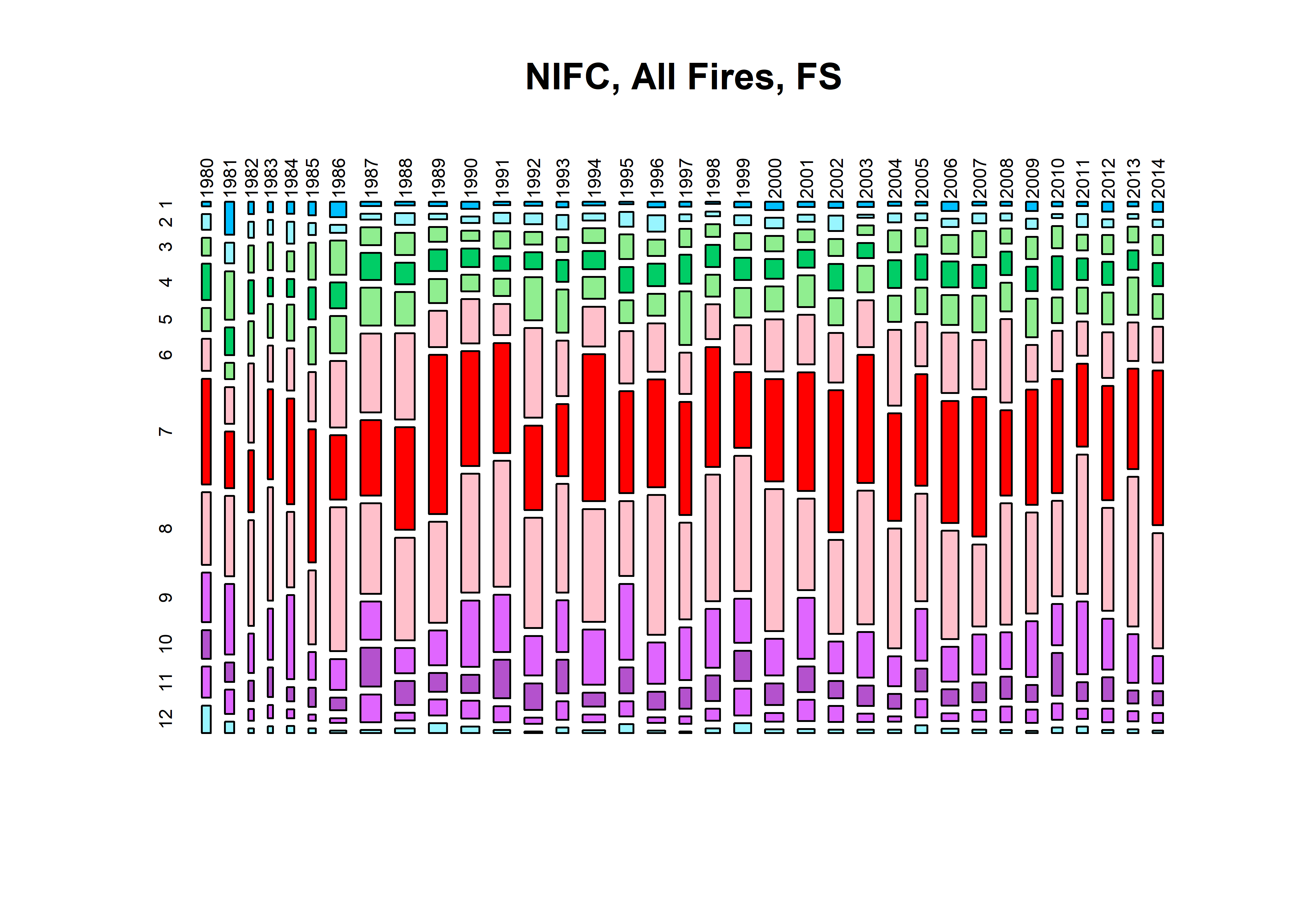 mosaicplot(nifc.tablemon, color=monthcolors, cex.axis=0.6, las=3, main="nifc, Human Fires, FS")