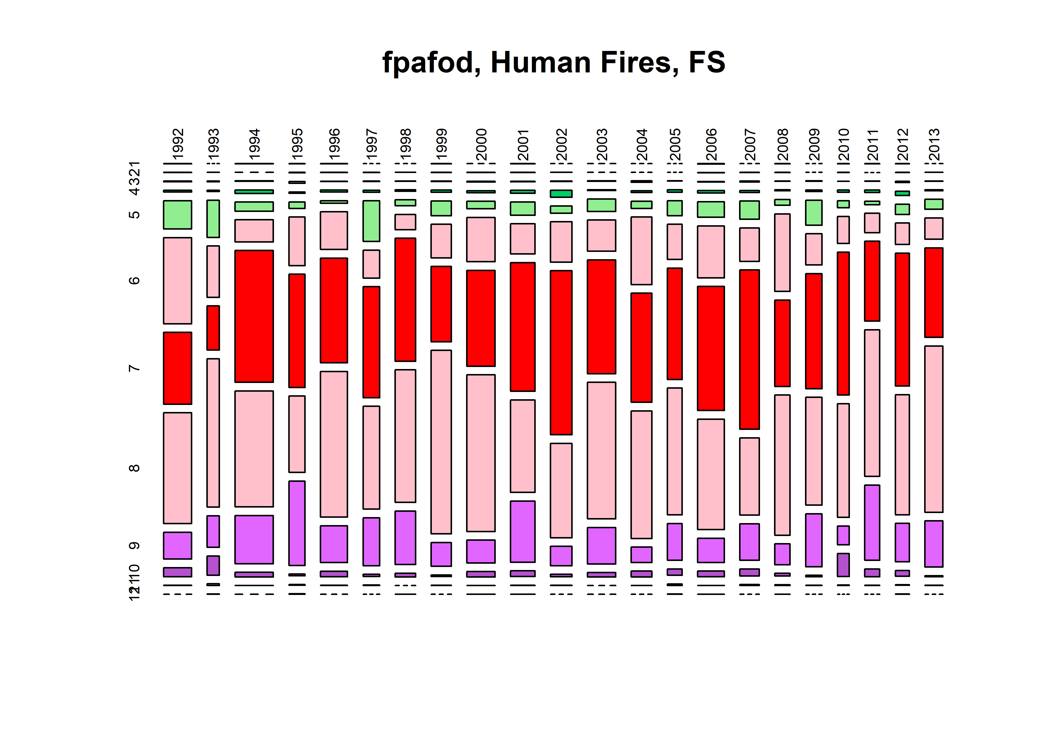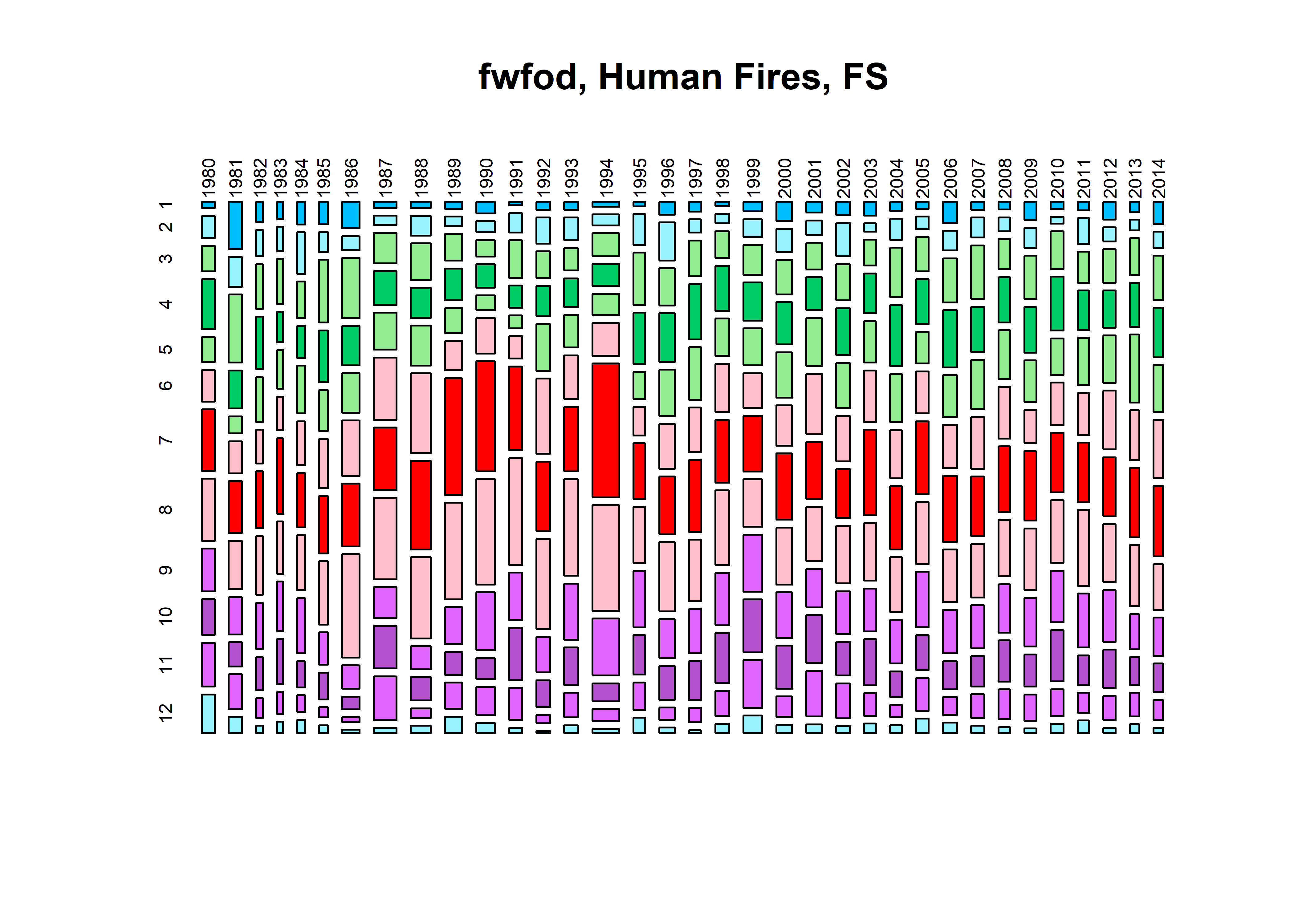mosaicplot(fwfod.tablemon, color=monthcolors, cex.axis=0.6, las=3, main="fwfod, Human Fires, FS")