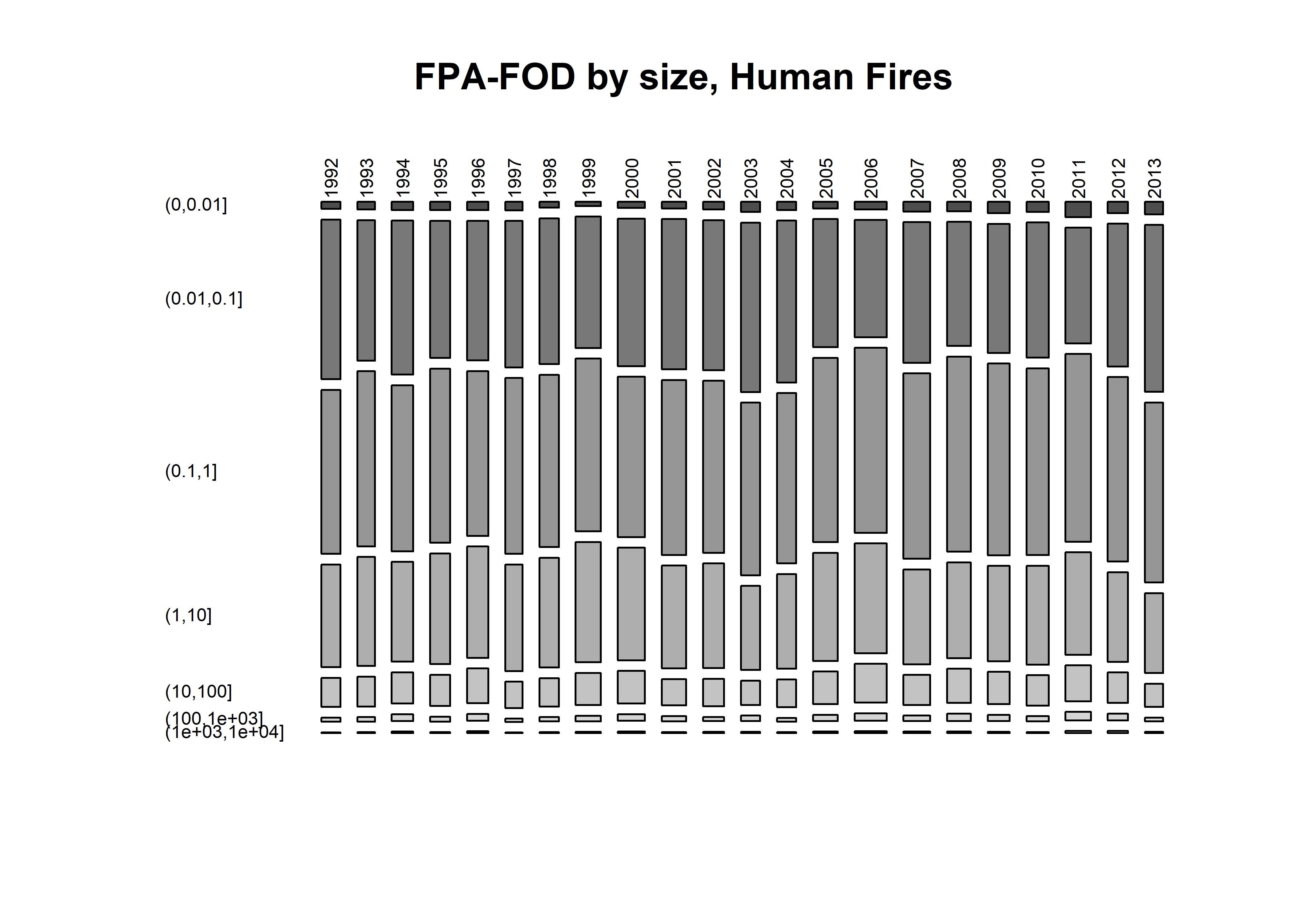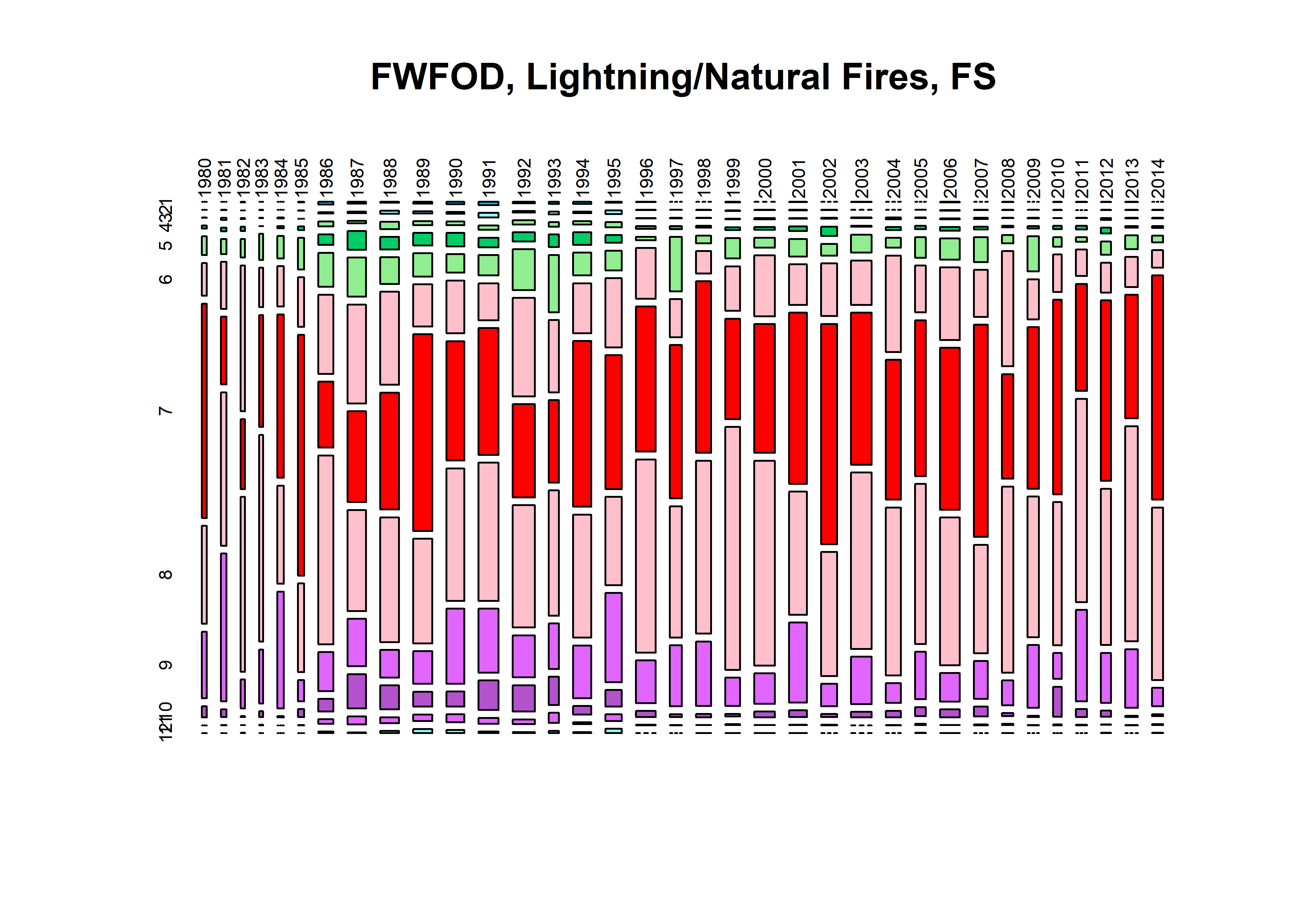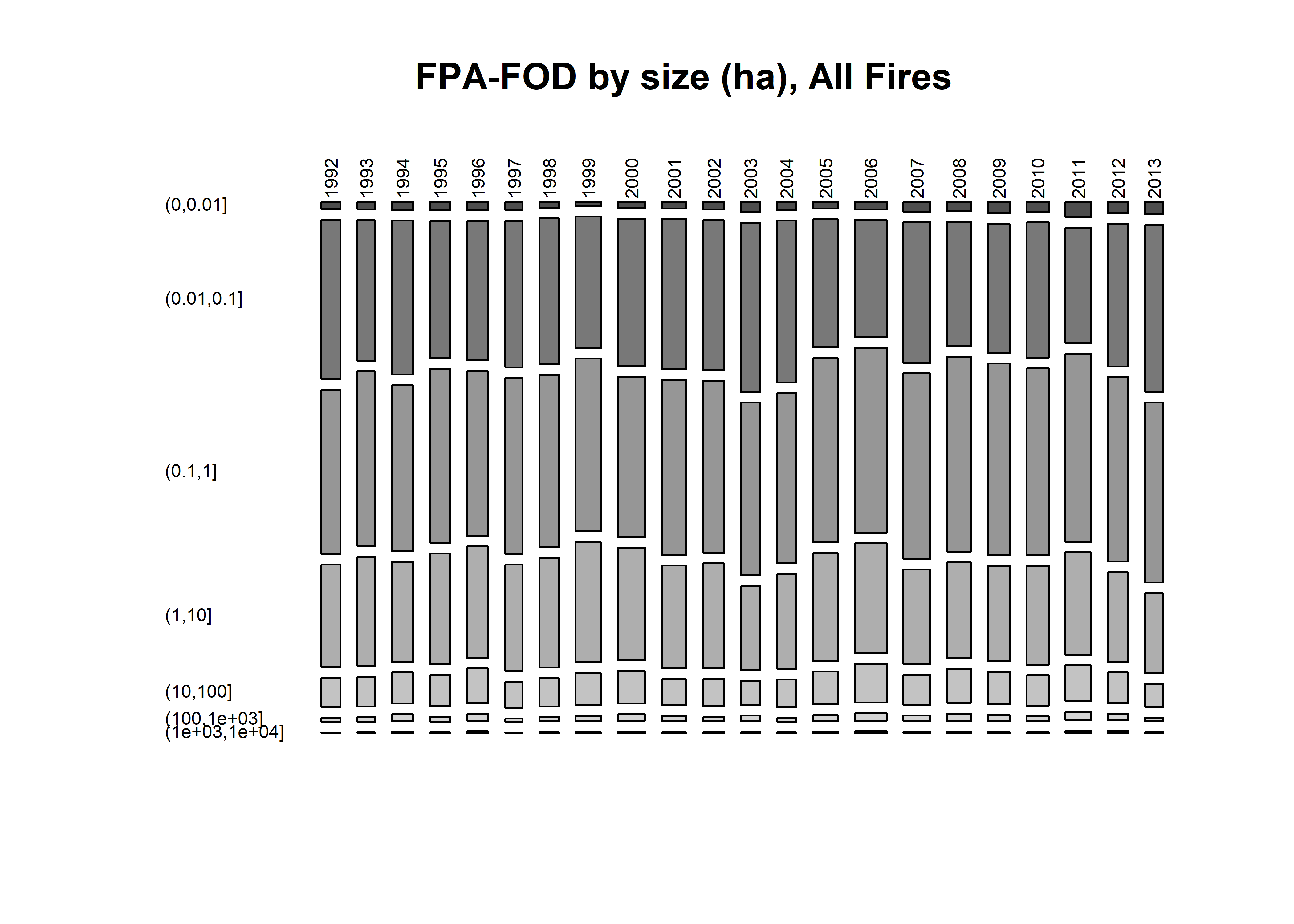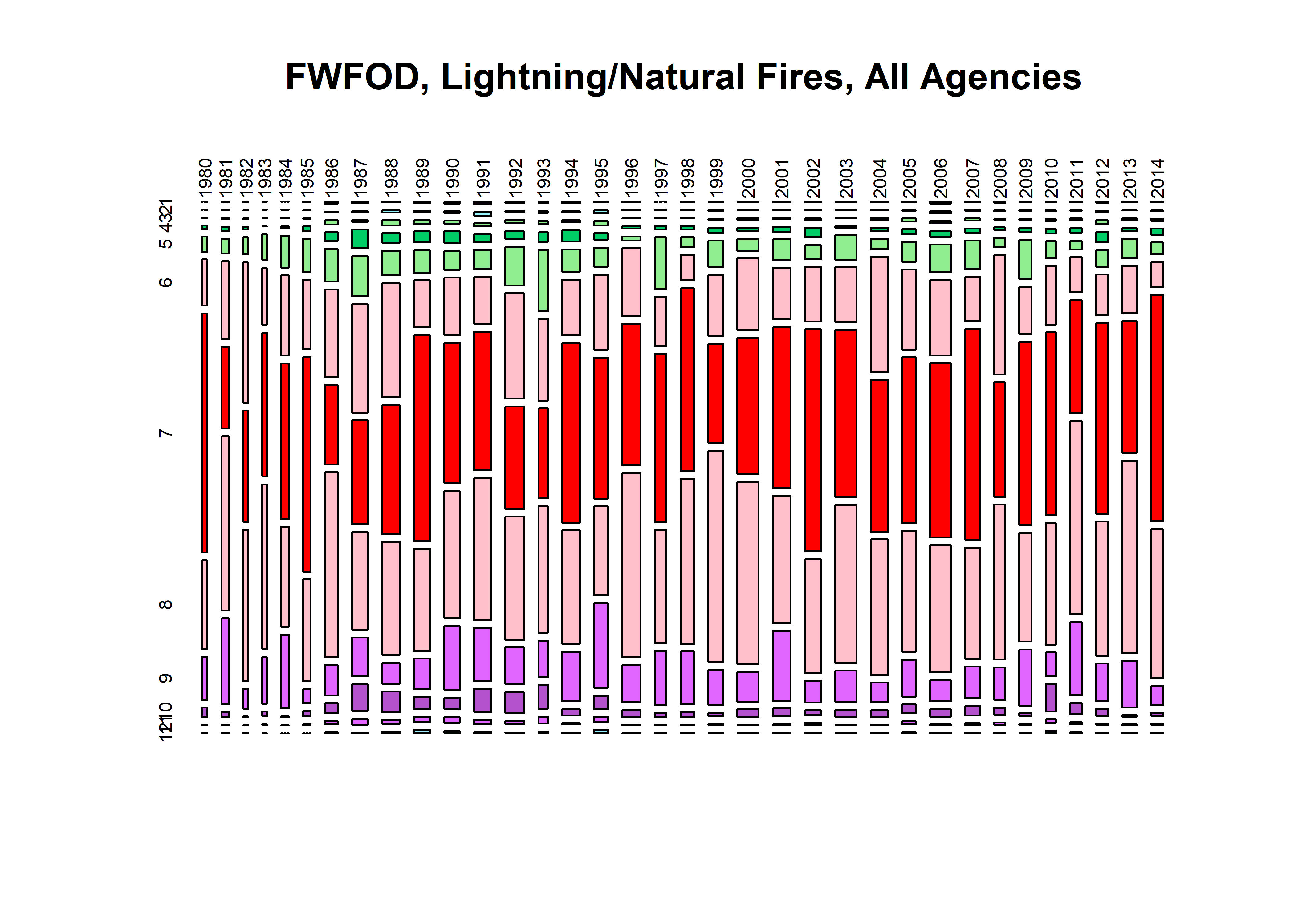 fpafod_num <- hist(fpafod$FIRE_YEAR, breaks=seq(1979.5,2015.5, by=1), plot = FALSE)