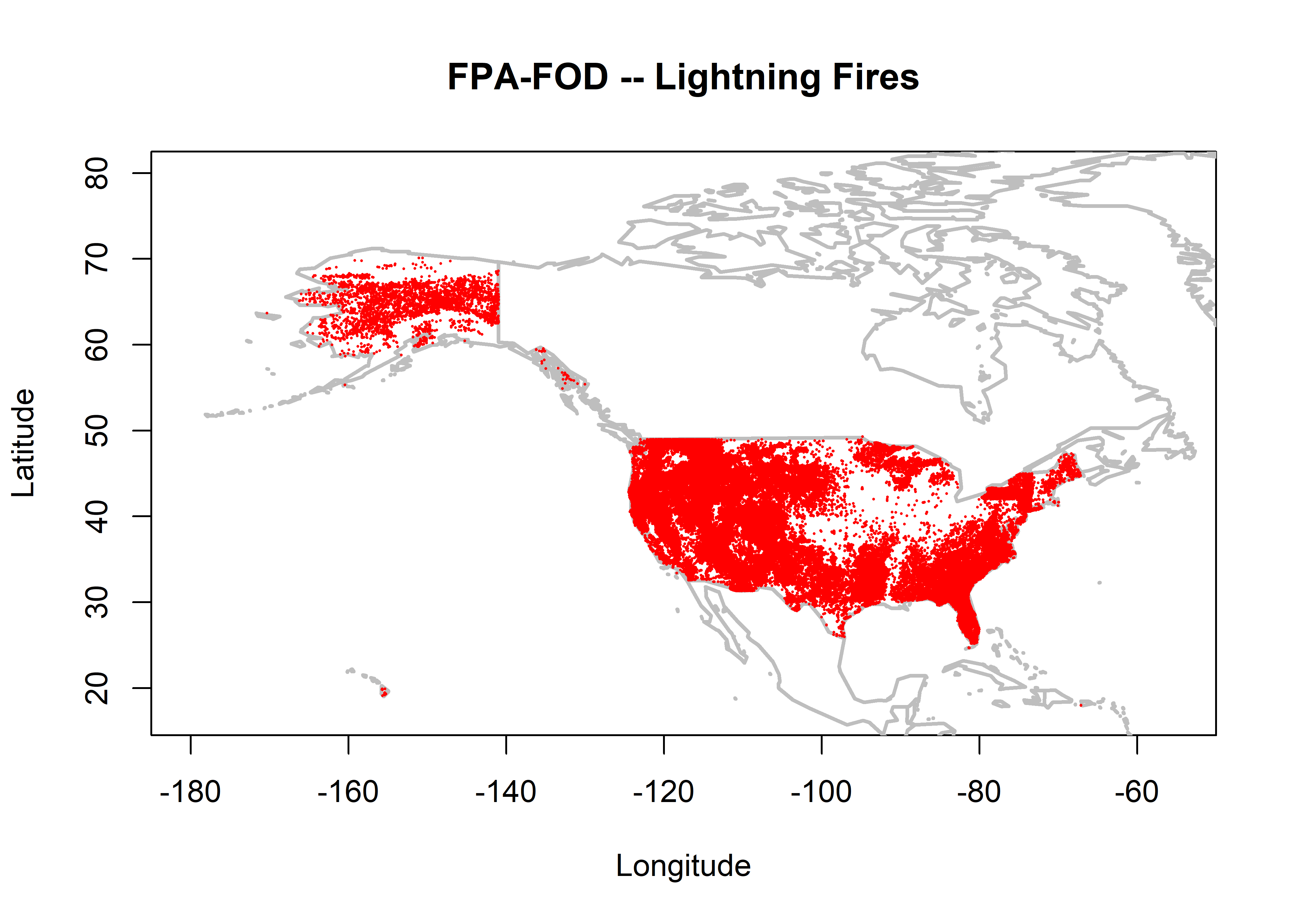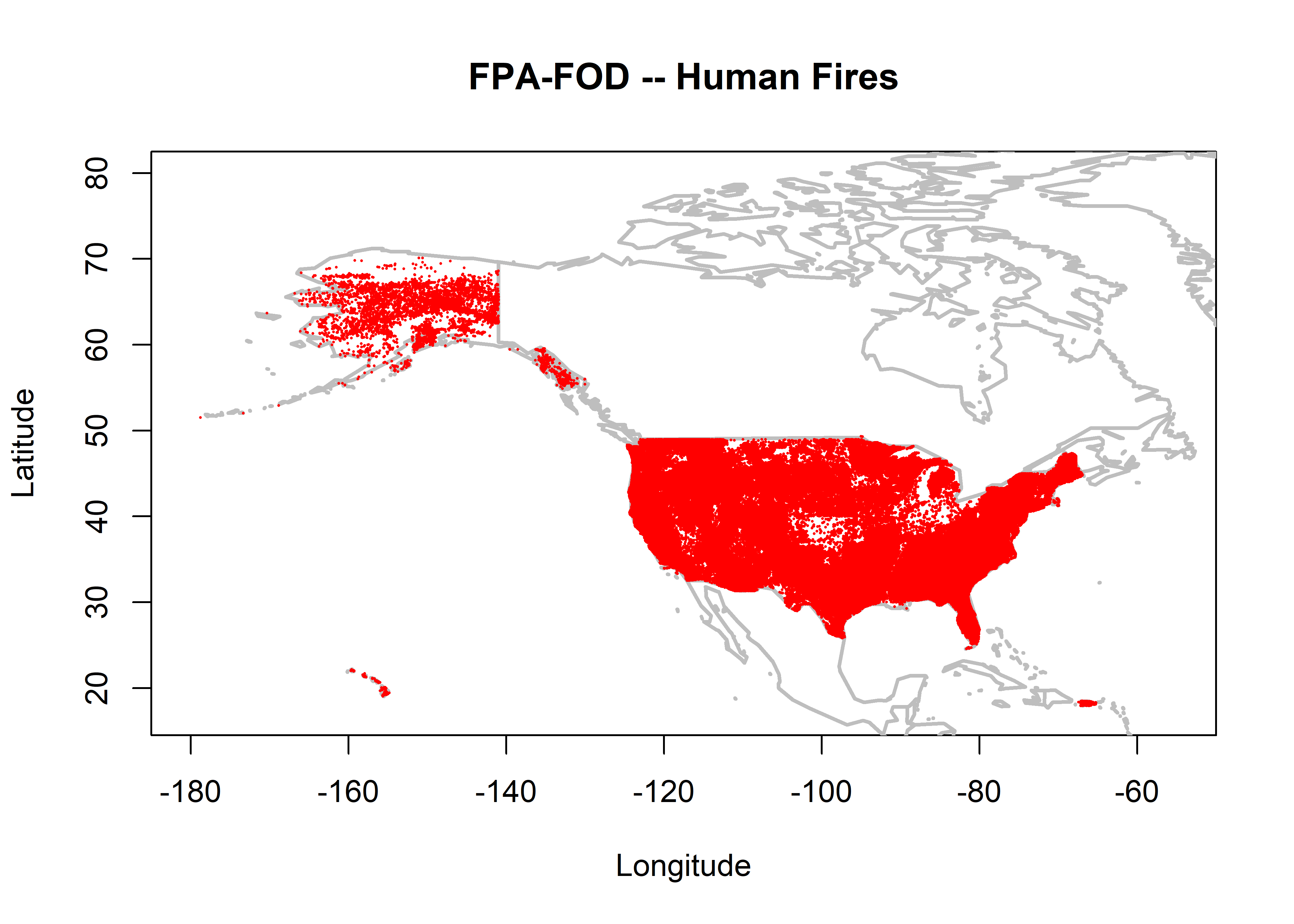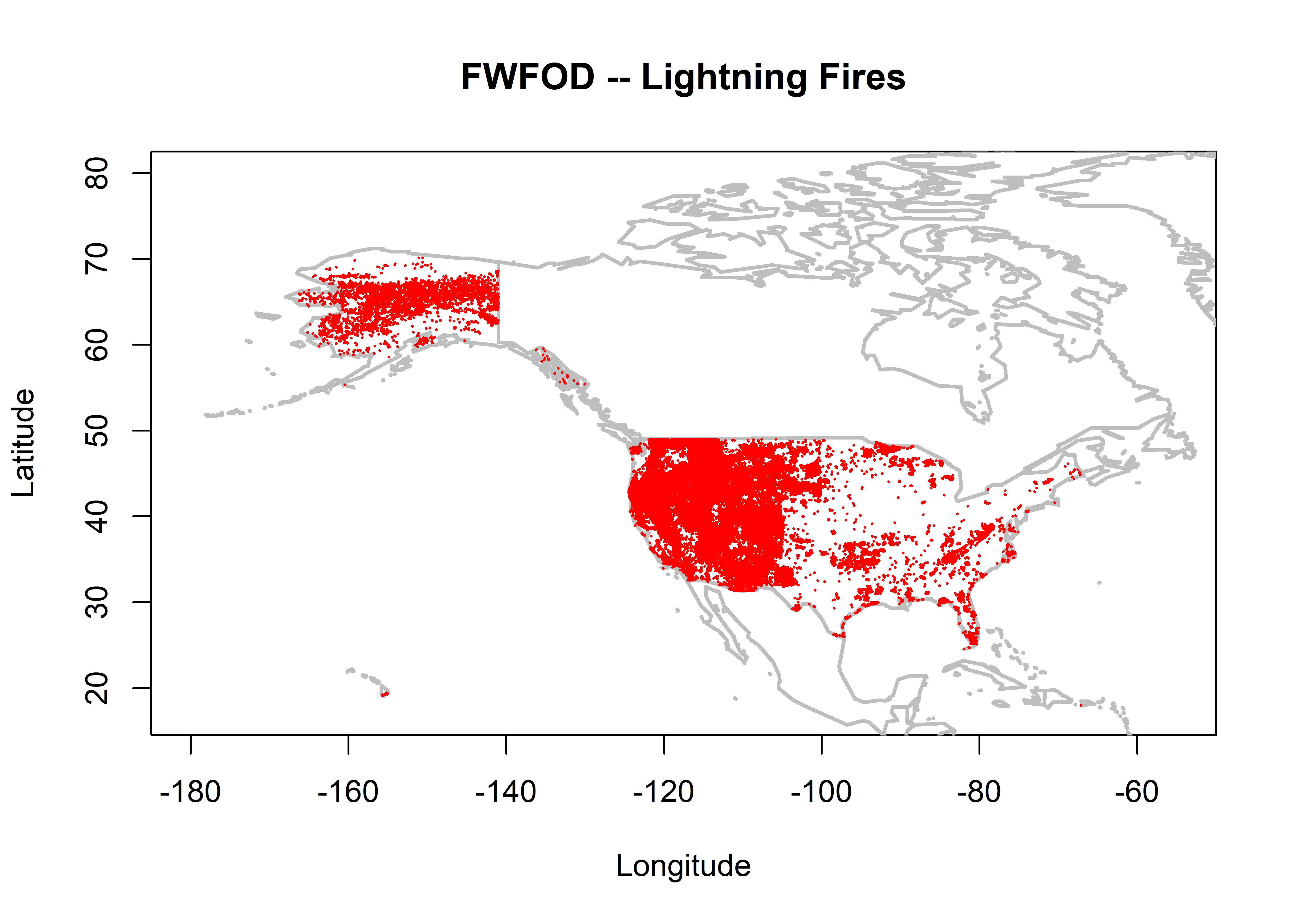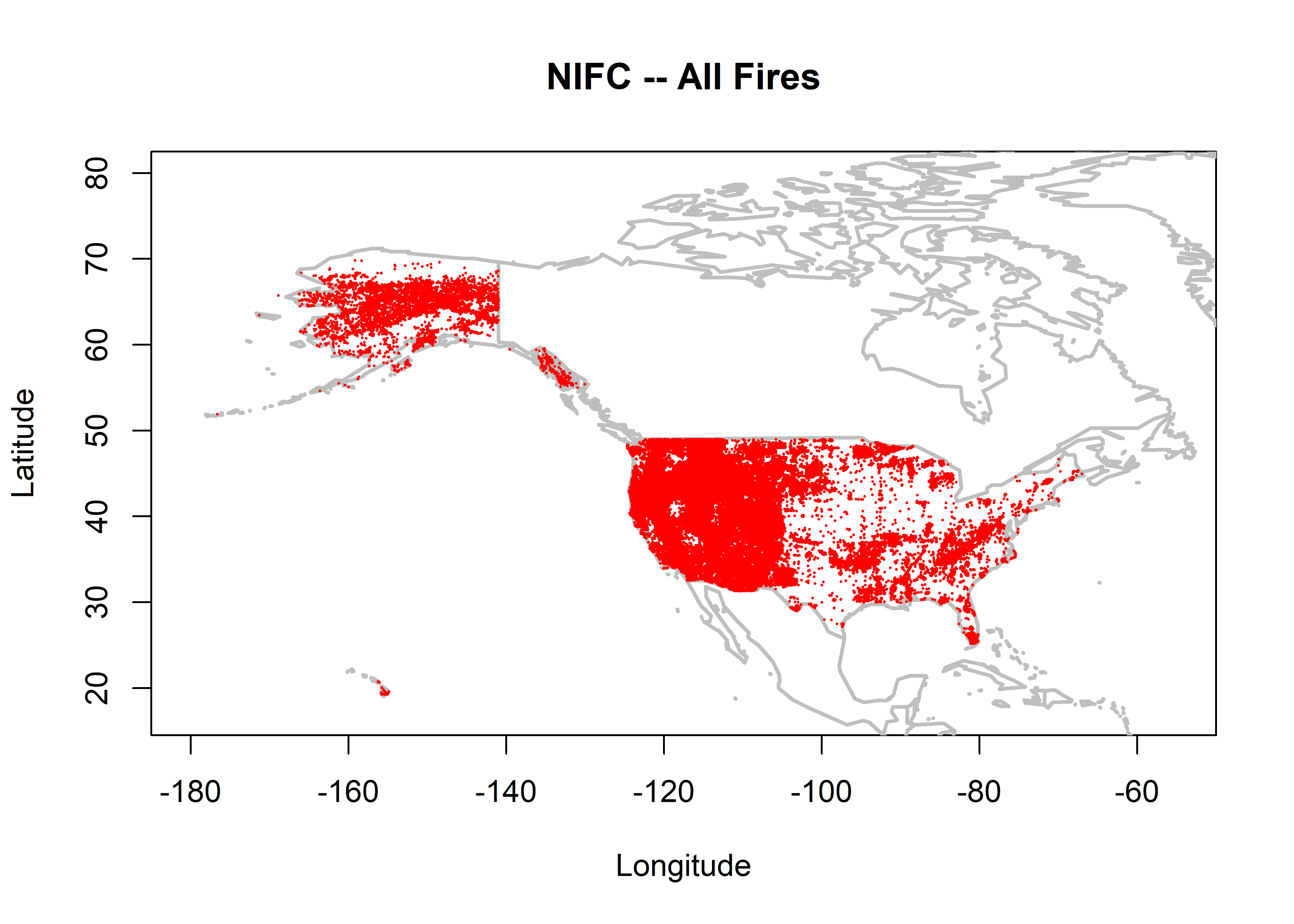 plot(nifc$LATITUDE ~ nifc$LONGITUDE, ylim=c(17,80), xlim=c(-180,-55), type="n",