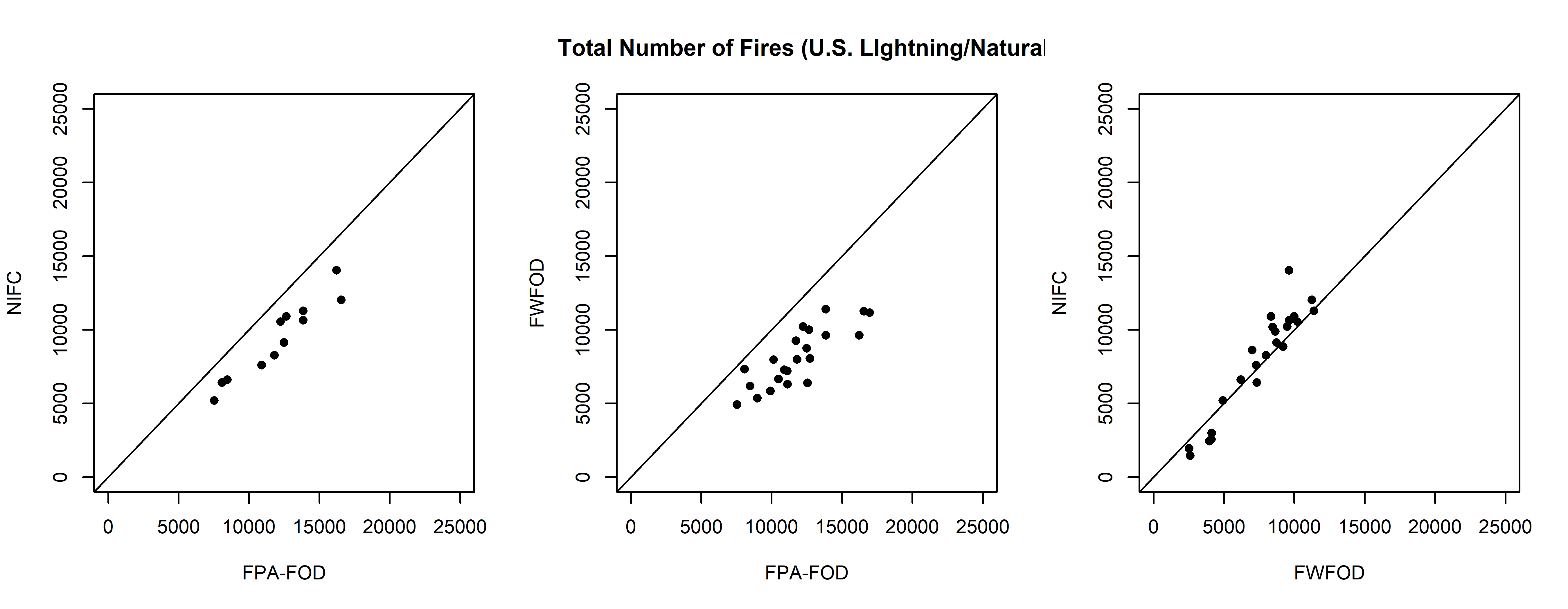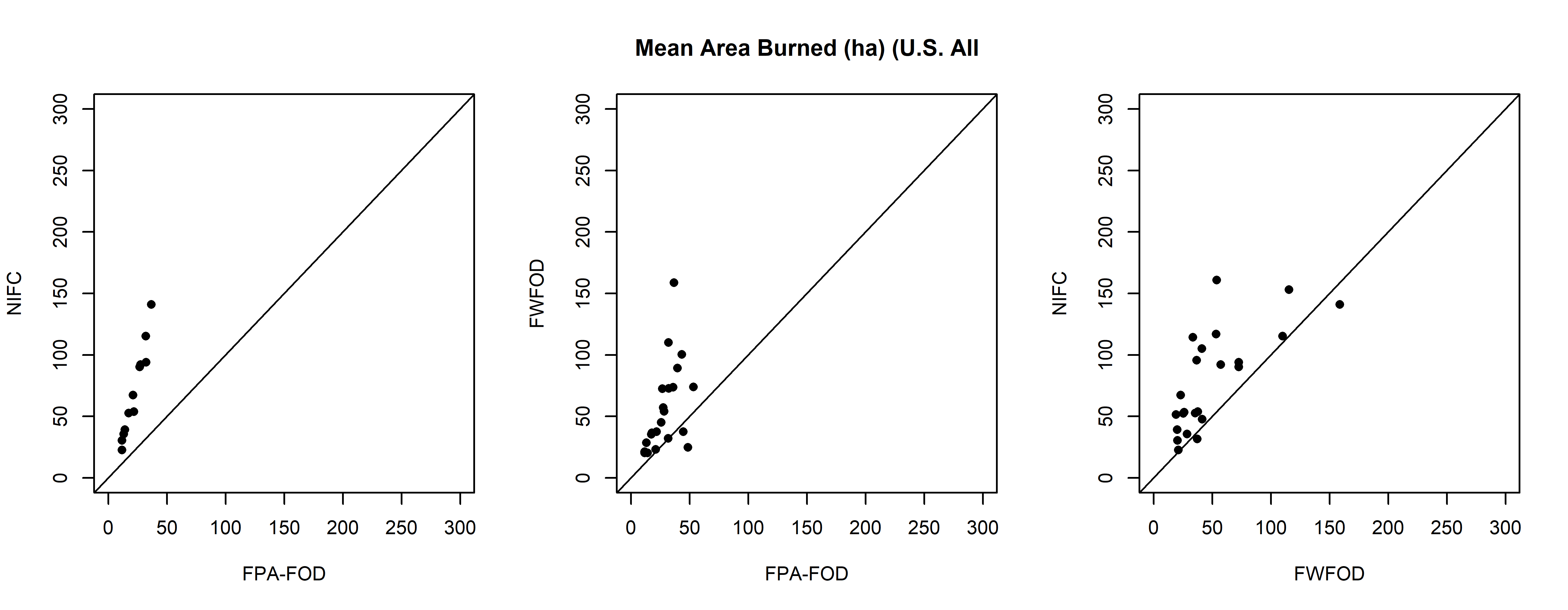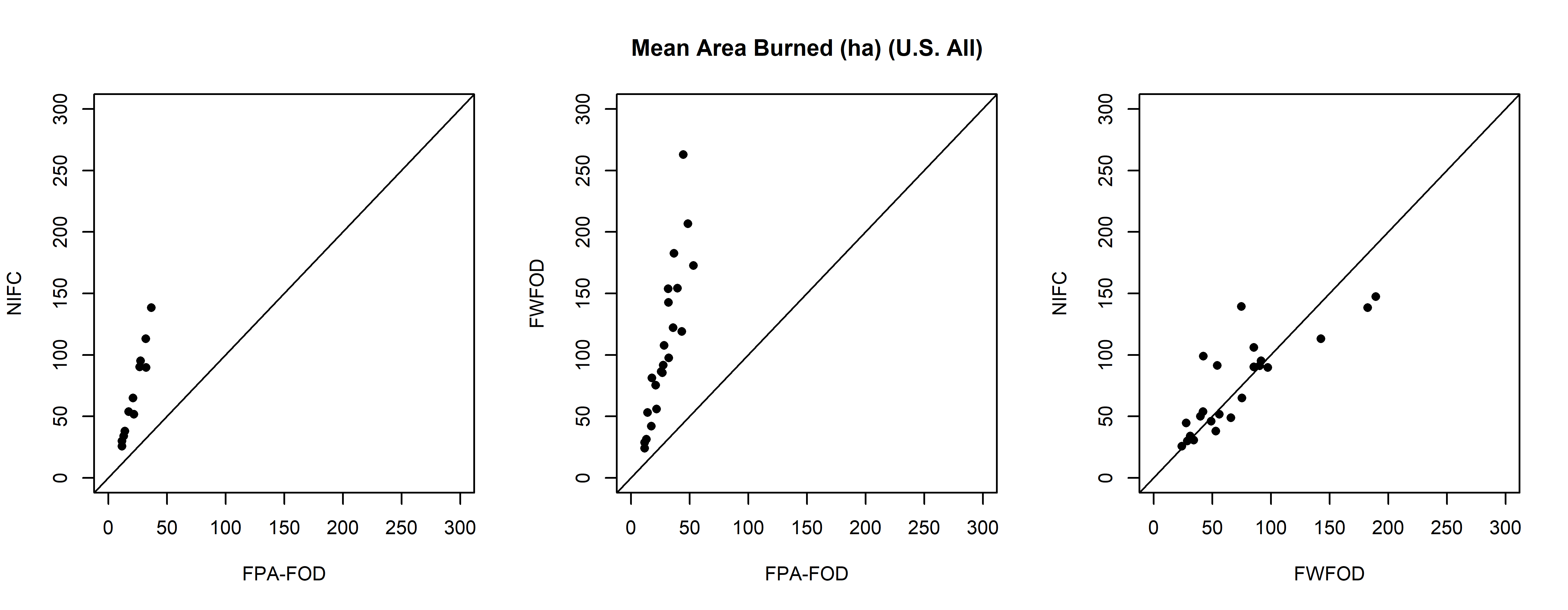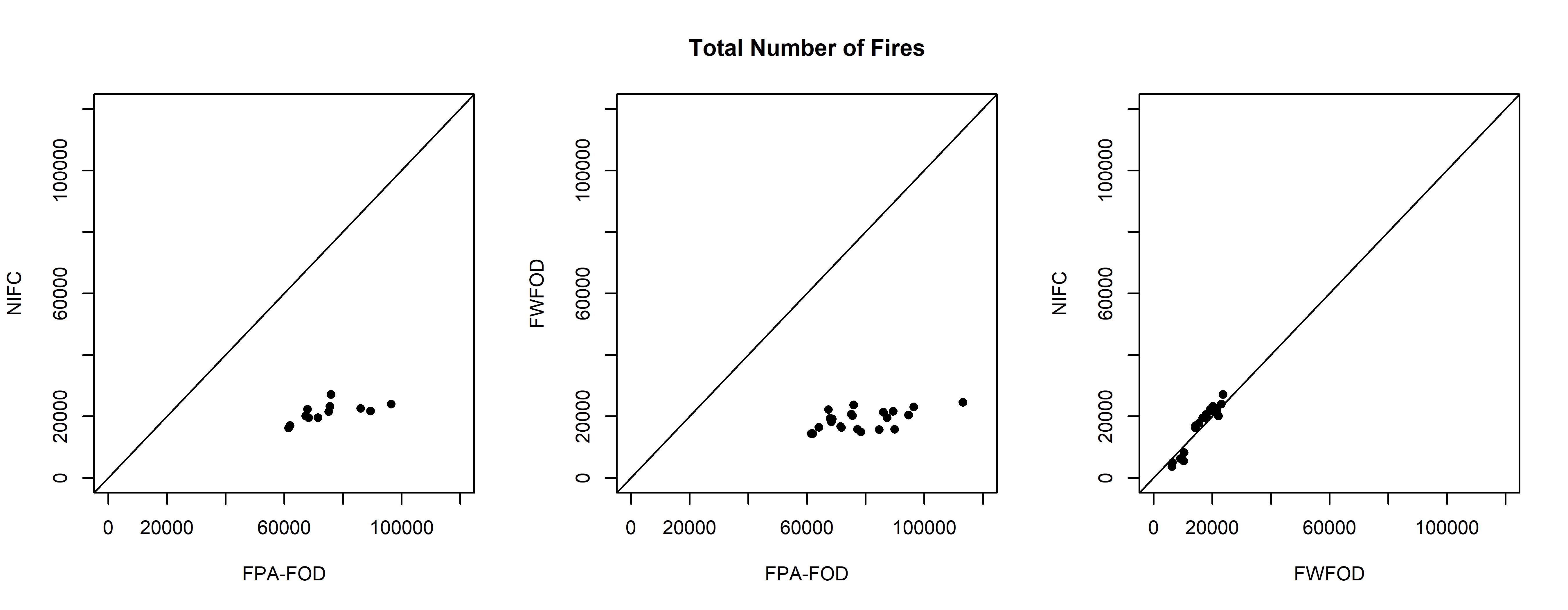 ylab="FWFOD", main="Total Number of Fires"); abline(0,1)