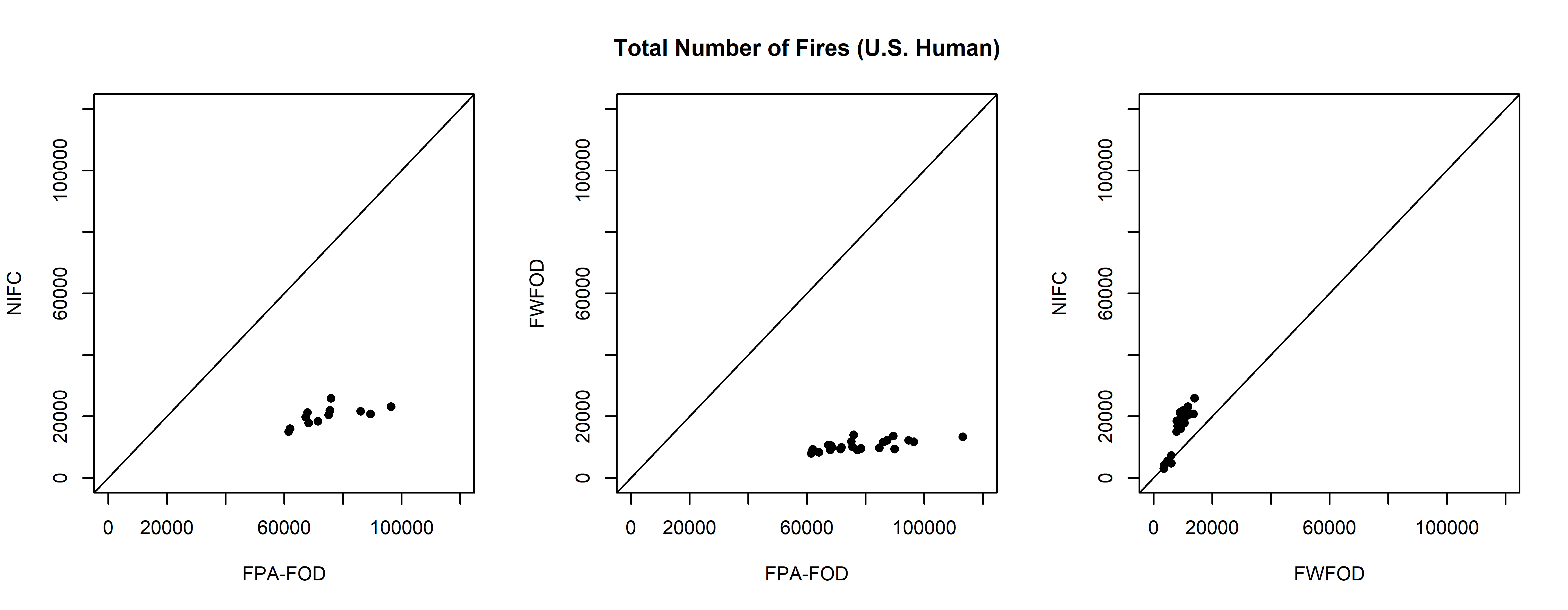 plot(all_num$fpafod_num, all_num$nifc_num, xlim=c(0,120000), ylim=c(0,120000), pch=16, xlab="FPA-FOD",